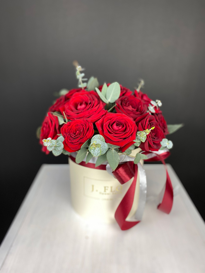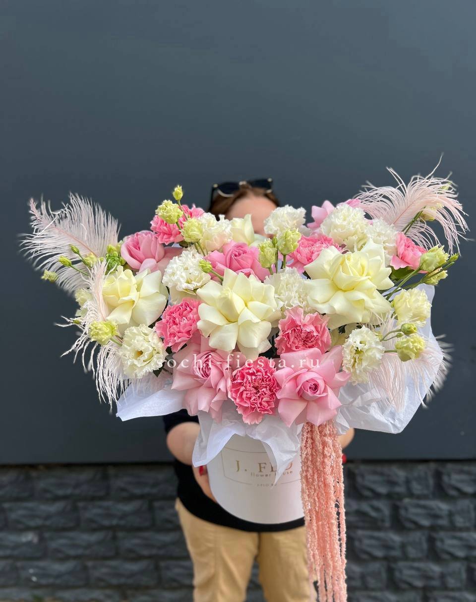 гортензии, эустома, розы, бомбастик, эвкалипт, антиринум в боксе 25.