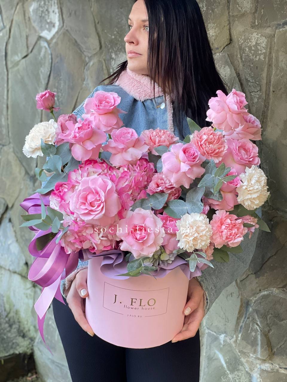 Розы, герберы и пышные соцветия гортензии в розово-голубой гамме наполняют бокс свежестью и легкостью. Каждый цветок раскрывается по-своему, создавая многослойную композицию. Готовое решение для яркого момента.