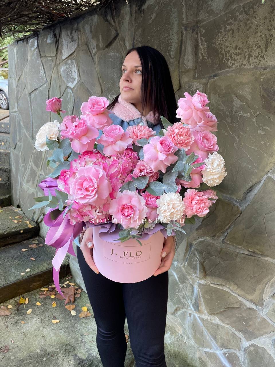 бокс из нежных розово-голубых цветов, розы, герберы, гортензии.