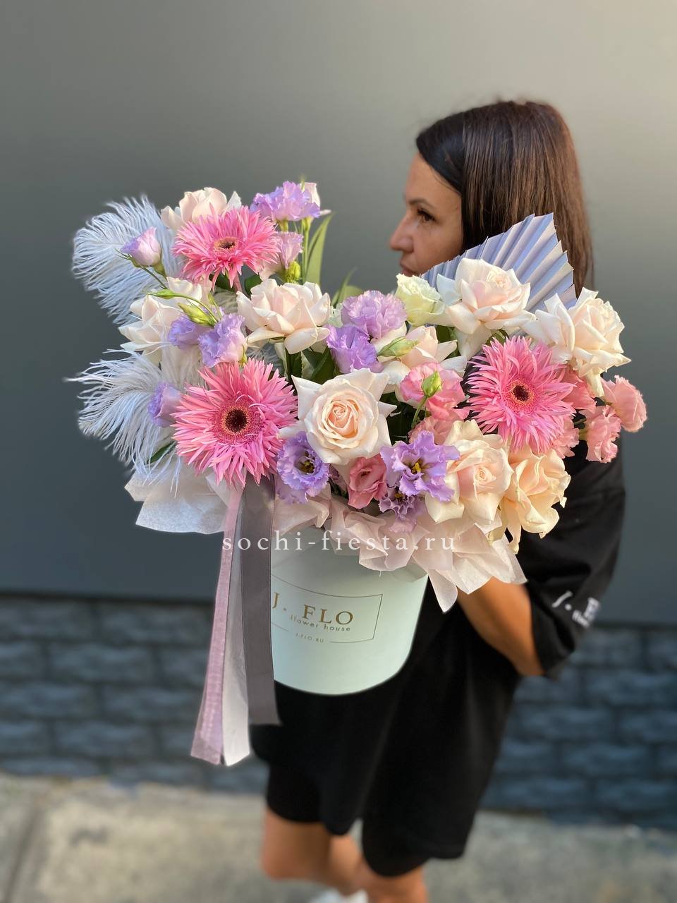 Французские розы переплетаются с герберами и эустомой в цилиндре большого диаметра. Объёмная композиция заполняет пространство и привлекает внимание сочной палитрой бутонов.