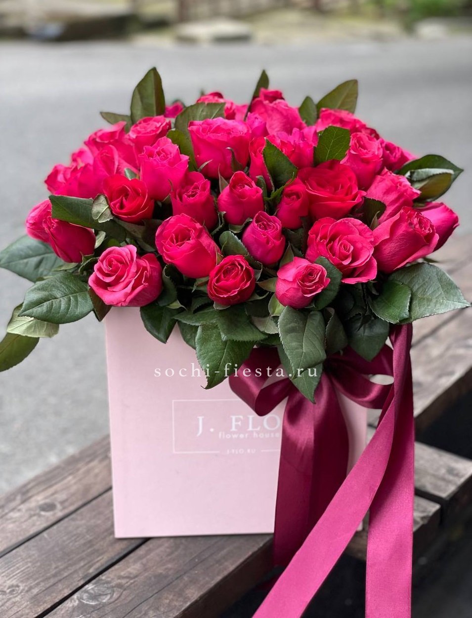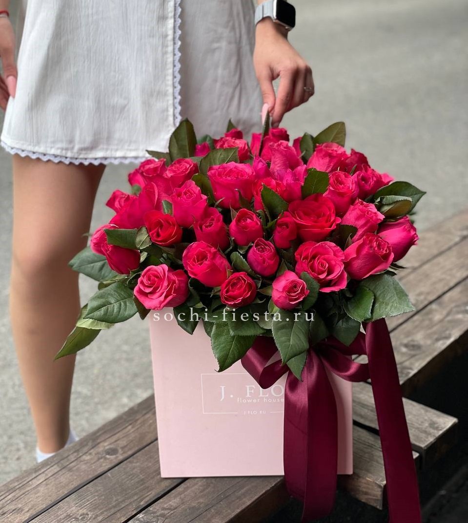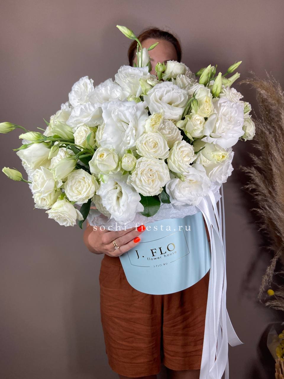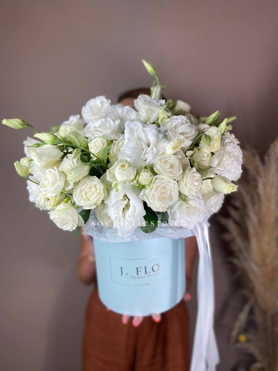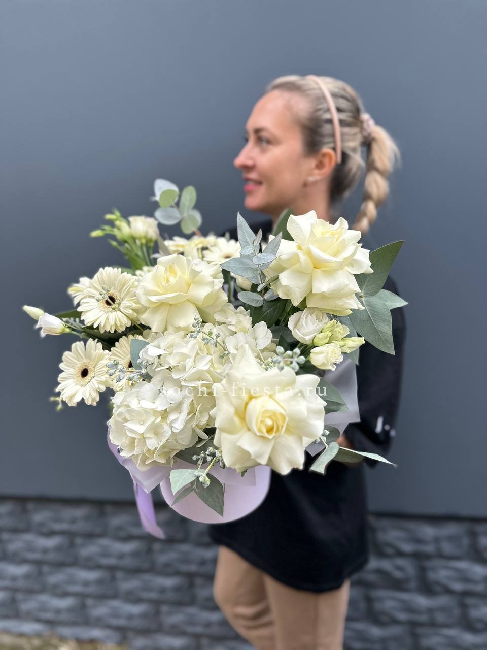 Настоящий взрыв цвета и позитива! Эта пышная и многосоставная композиция в стильной коробке притягивает взгляды богатством форм и оттенков — от нежно-розового до насыщенного белого. Это не просто цветы, а целая история о радости, празднике и восхищении. Подарок, который гарантированно произведет яркое впечатление и останется в памяти надолго.