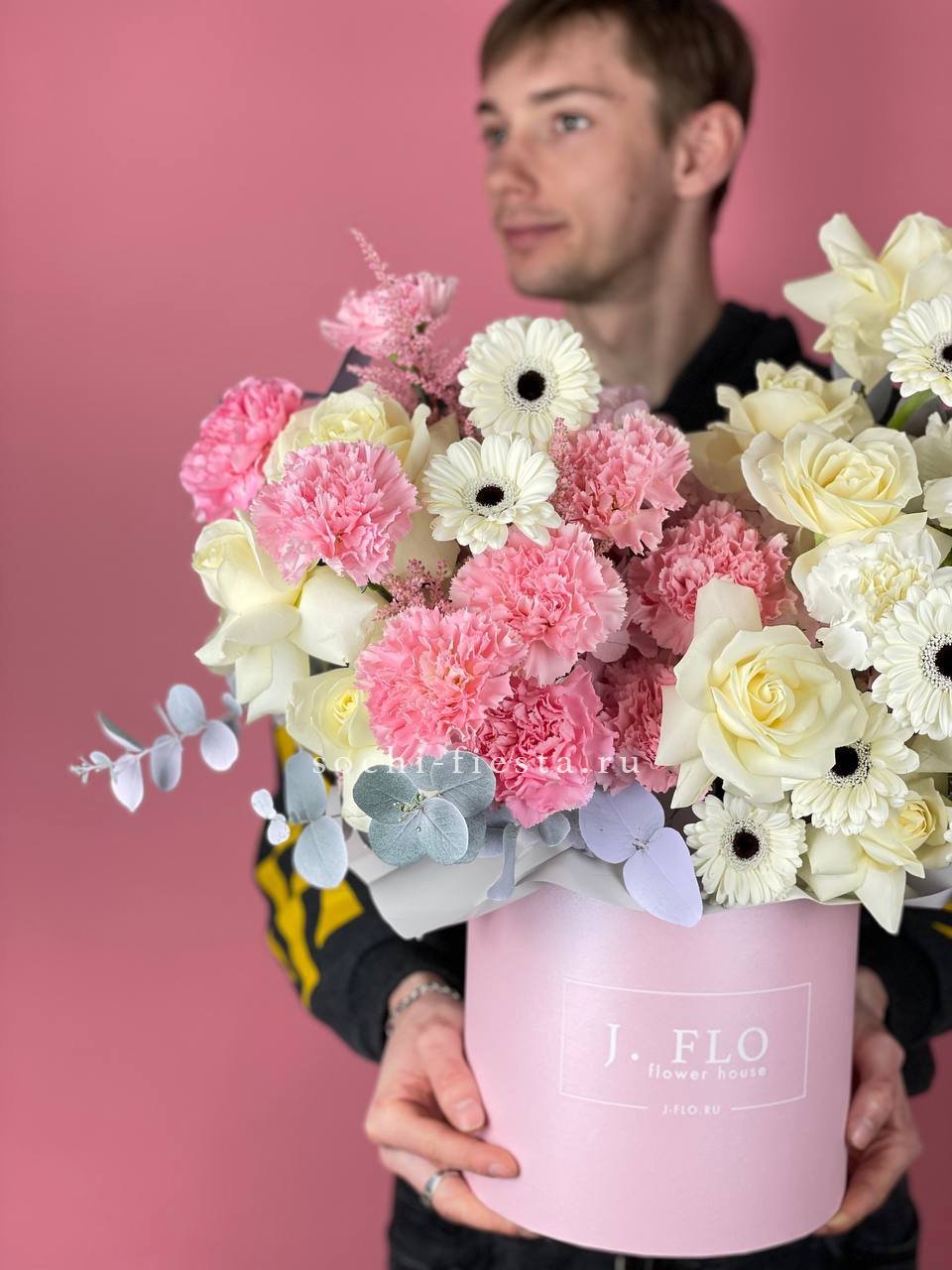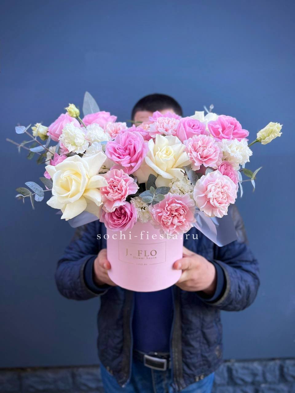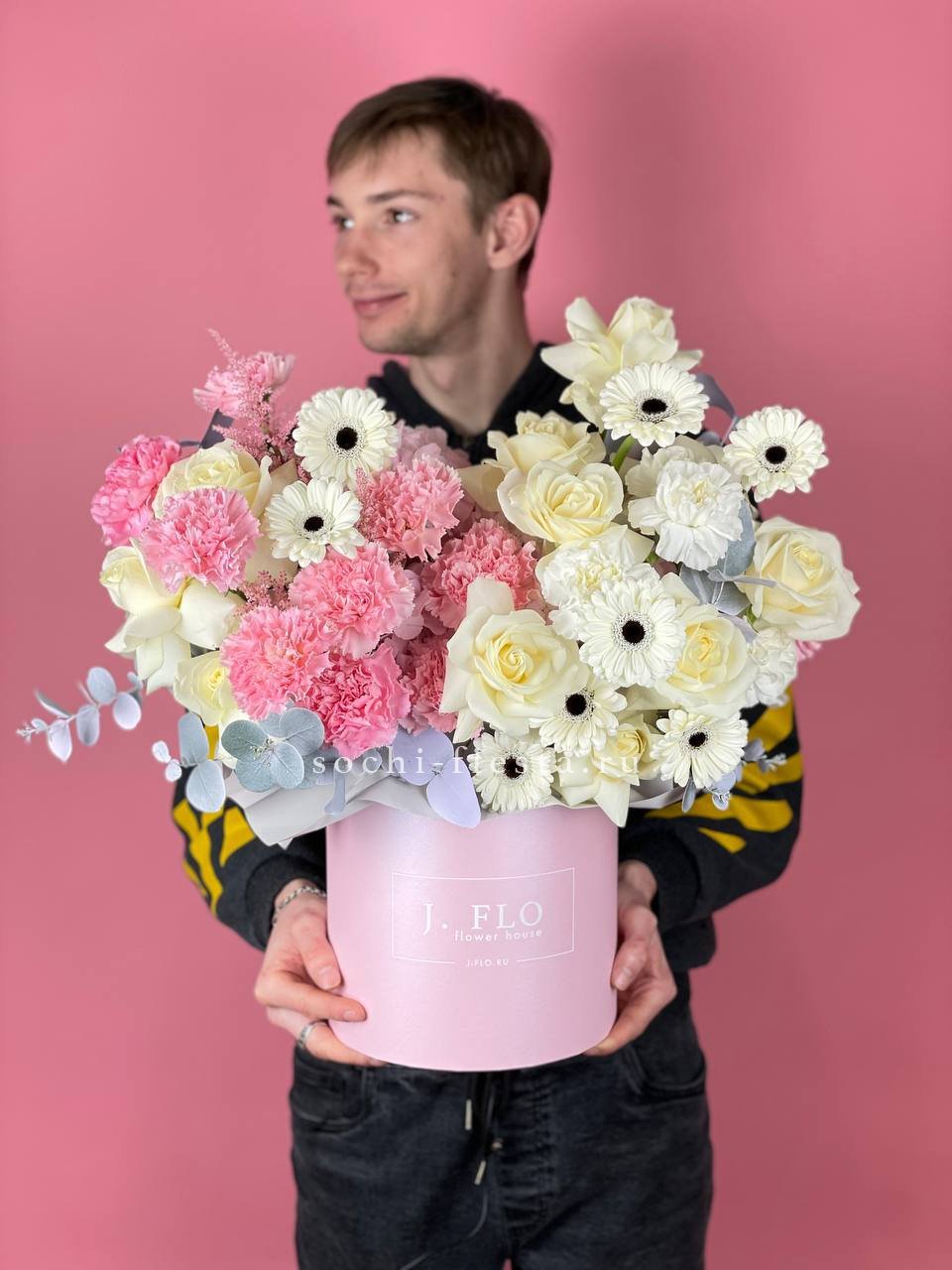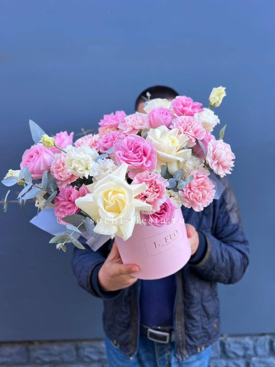 цветочная композиция в розово-белых тонах в розовом цилиндре D20-25.