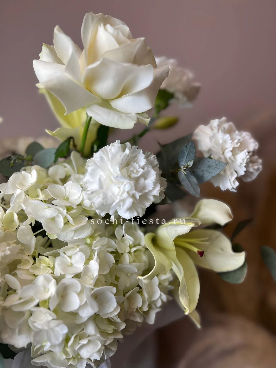 Белоснежная гамма раскрывается через лилии, розы и пышную гортензию с добавлением диантуса. Эвкалипт придает объём и глубину всей композиции в цилиндре.