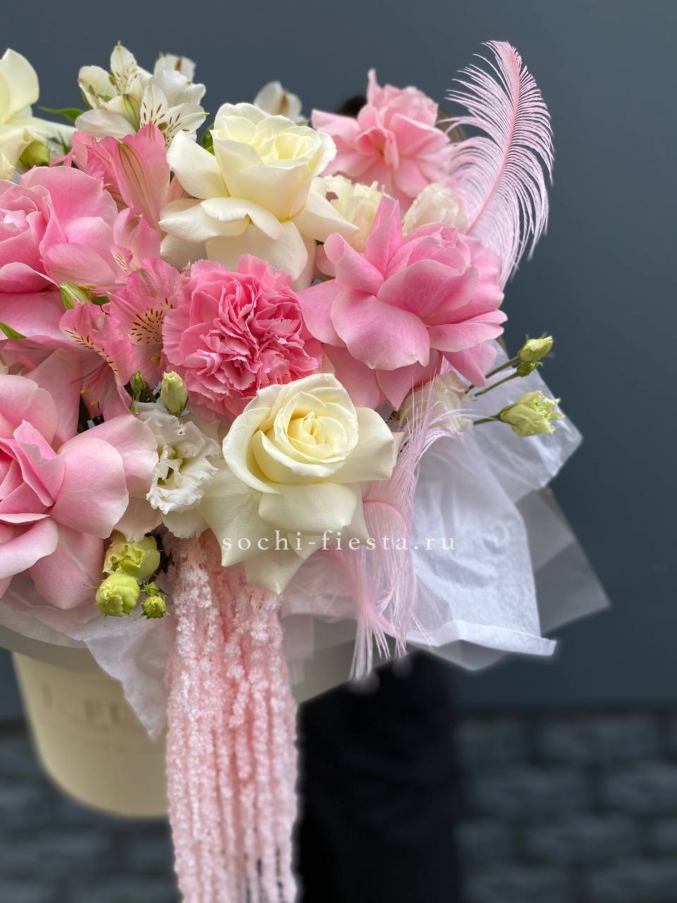французские розы, альстромерии, маттиола, эустома, амарантус, перья.