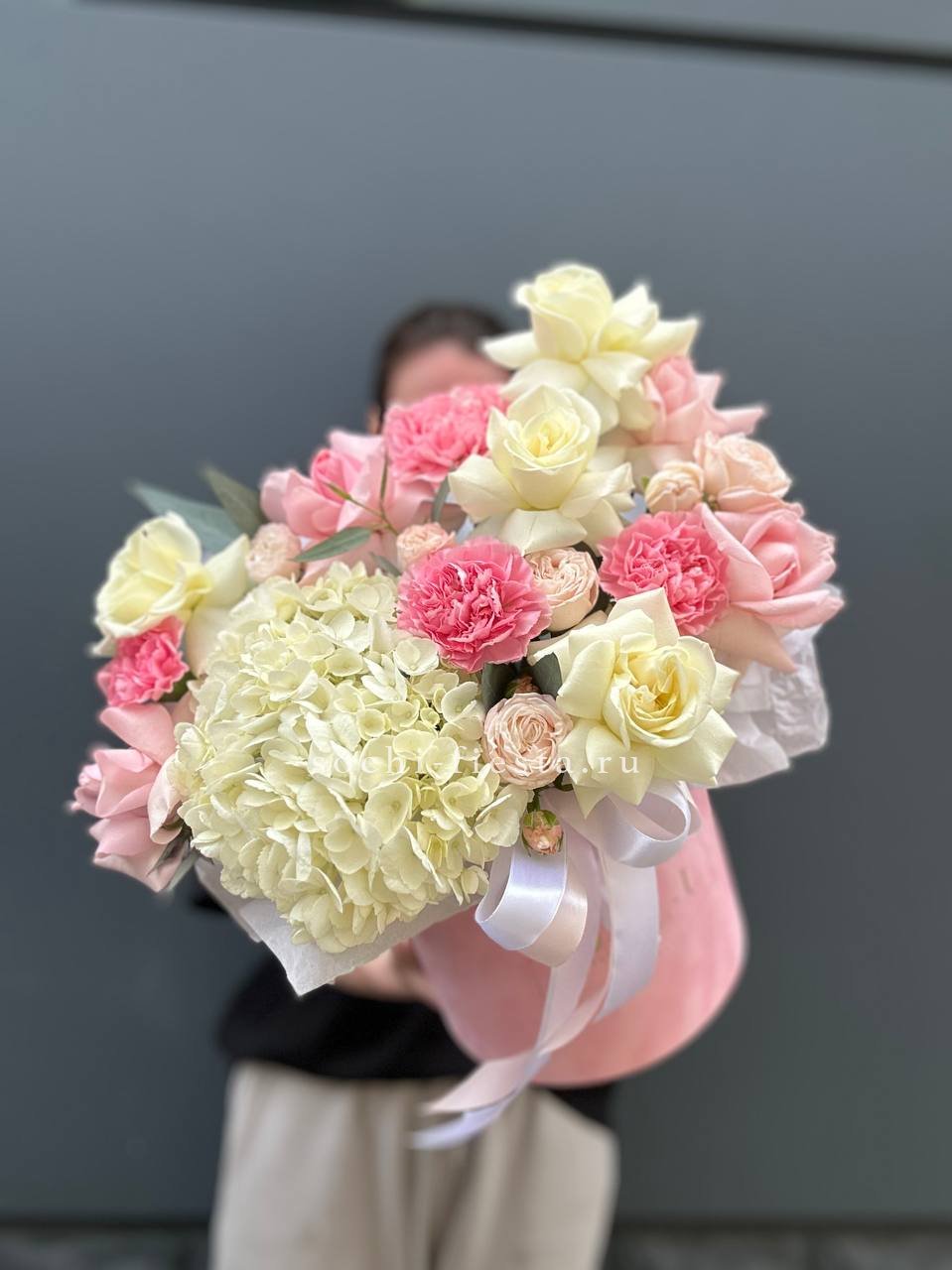 гортензия, одноголовые розы, пионовидные розы, диантусы, лента, цилиндр D20.