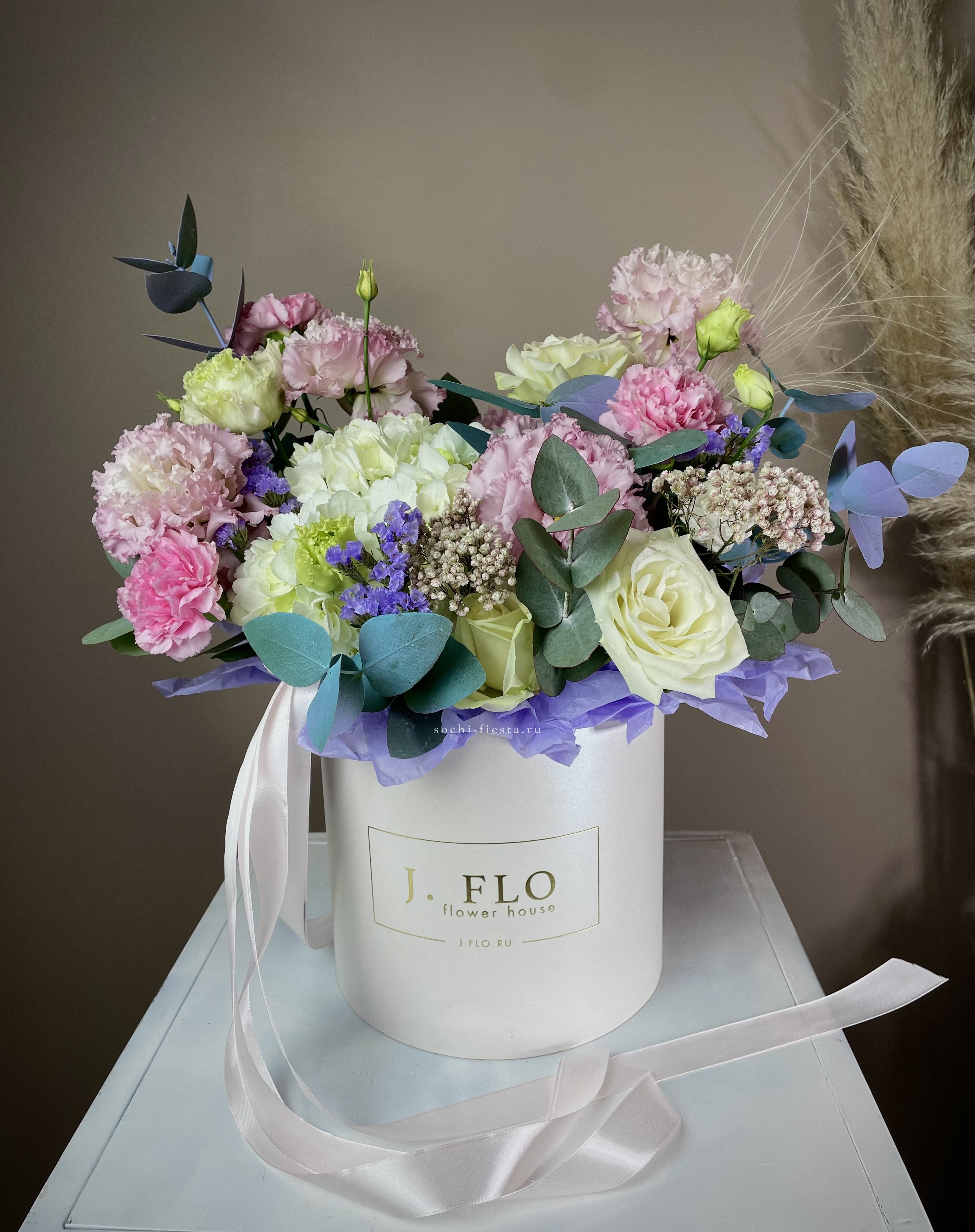Эустома и пионы в цилиндре дают мягкое цветовое пятно с воздушной текстурой. Эвкалипт обрамляет композицию и добавляет свежую зелёную ноту общему впечатлению.