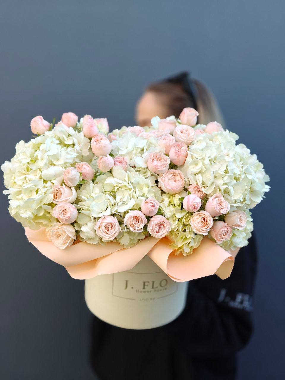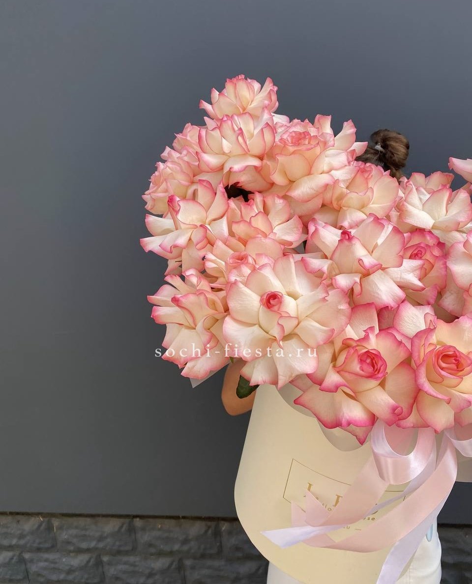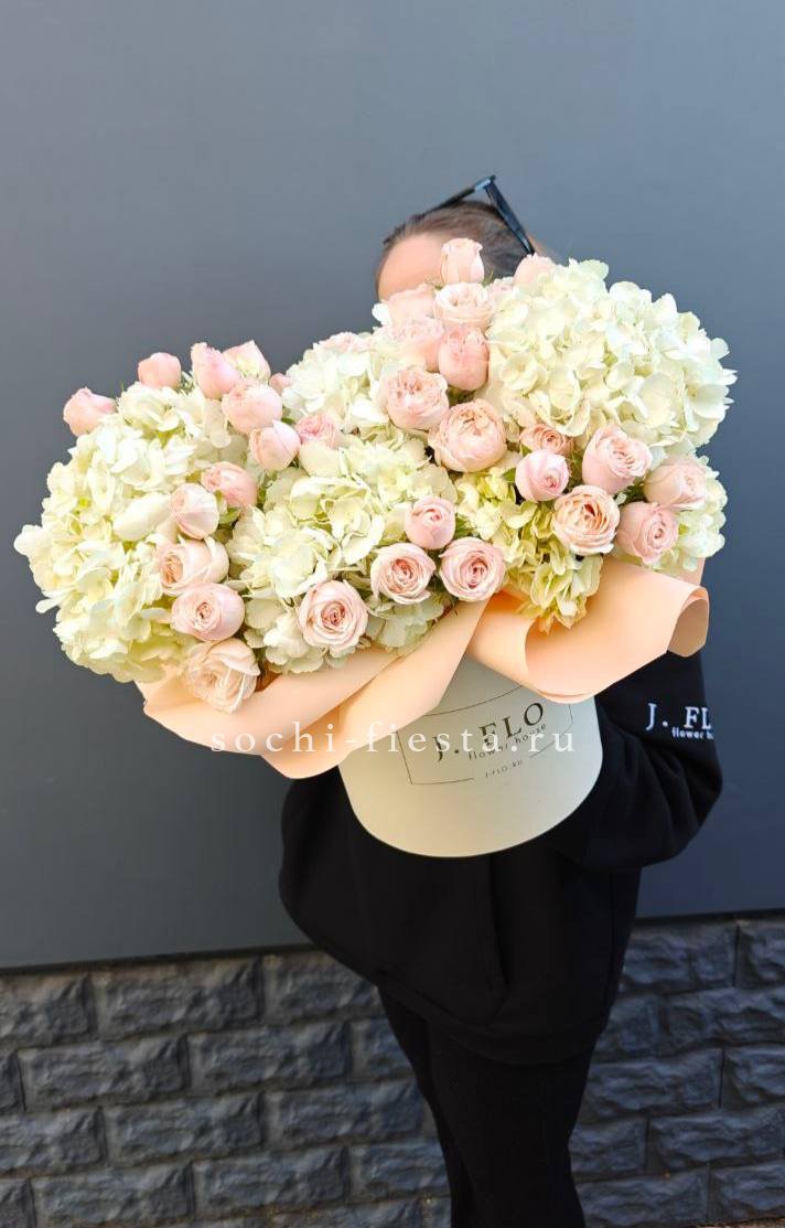 Пионовидные розы Мисти Баблс и экзотичные орхидеи Цимбидиум создают композицию с мягкими переходами оттенков. Цилиндрическая форма собирает цветы в плотную структуру с выразительным силуэтом.
