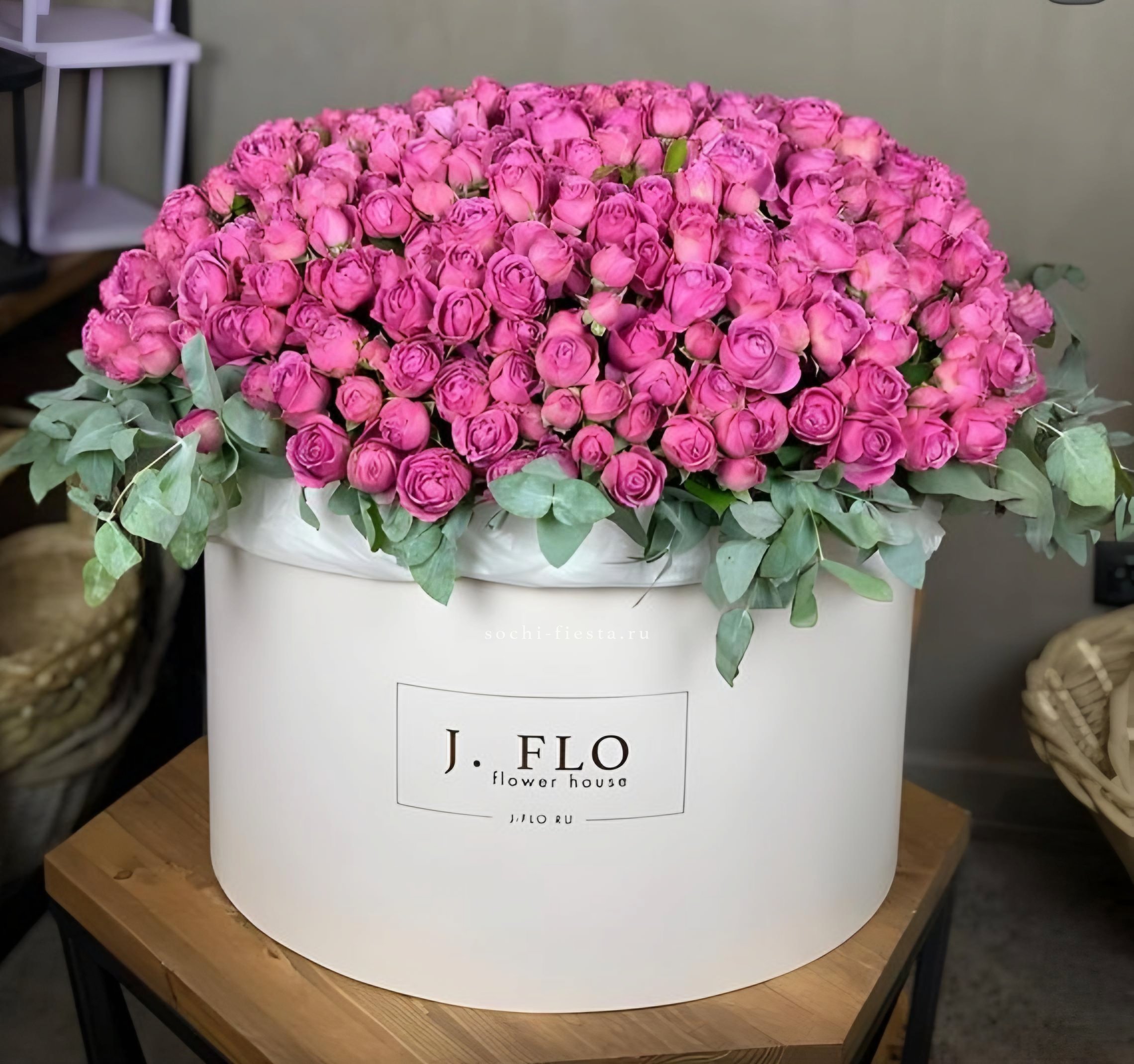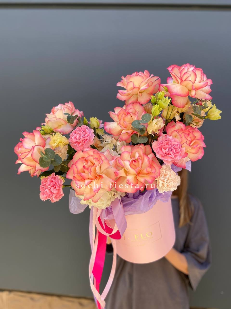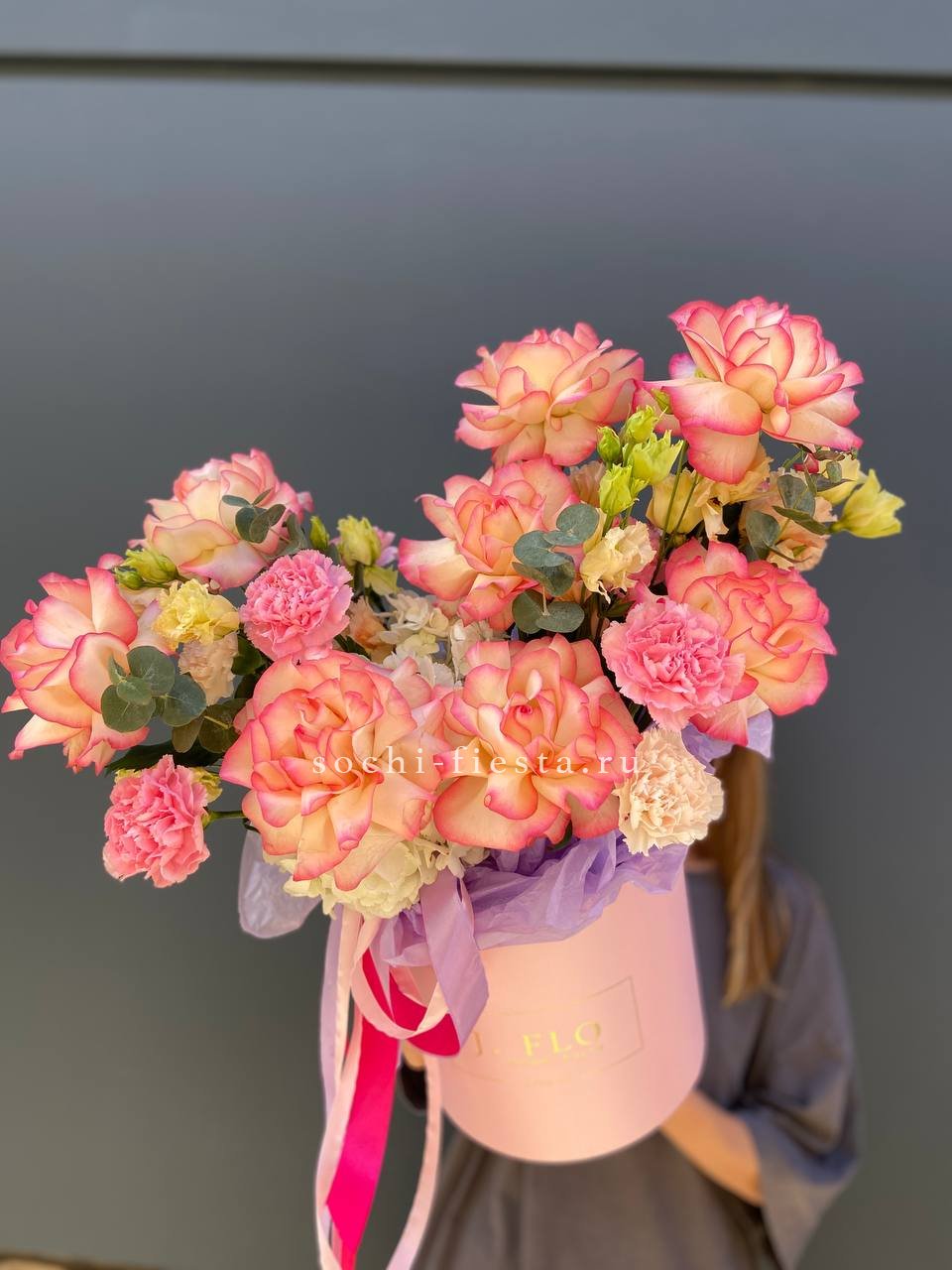 Гортензия создает пышную основу для французских роз и диантусов с эустомой. Цилиндр компактен и не требует дополнительной вазы. Розовая гамма раскрывается слоями от бледных до насыщенных оттенков.