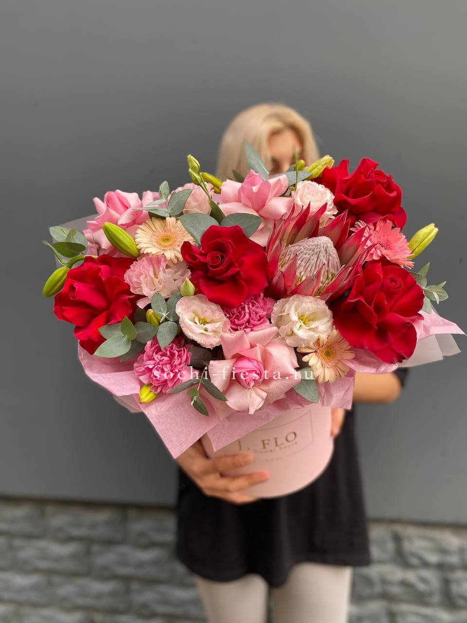 розы, протея, диантус, гербера, эустома, лилия, бокс 20.