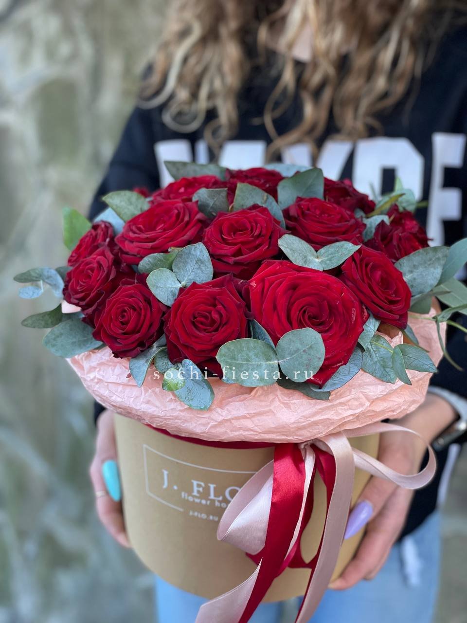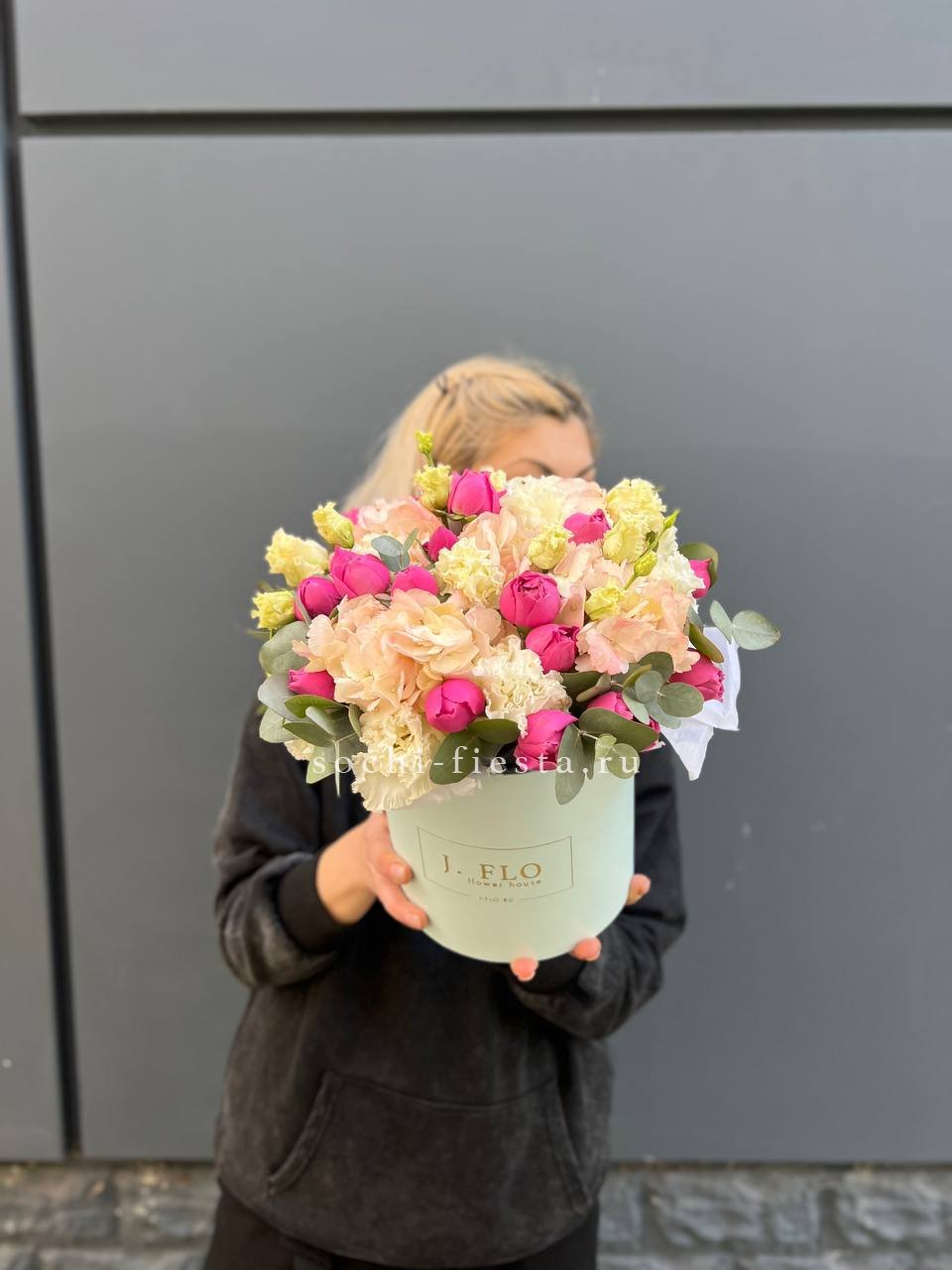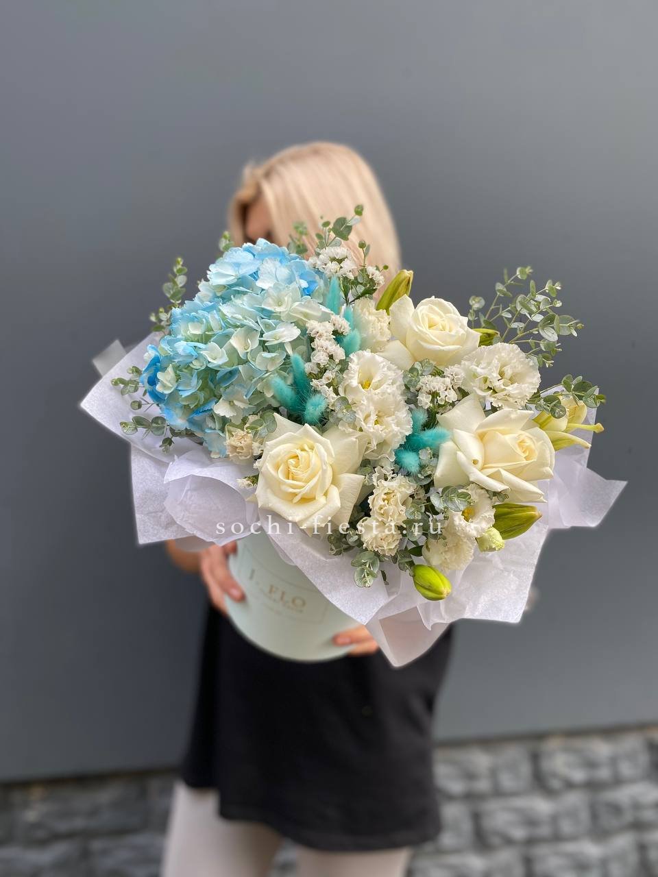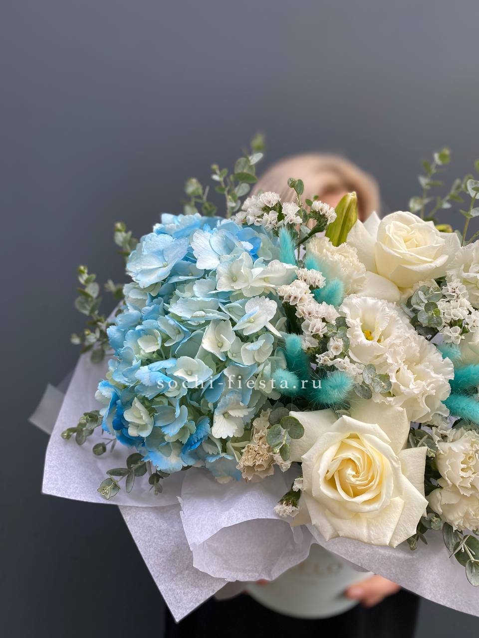 гортензия, пионовидные розы, эустома, эвкалипт, бокс 16.