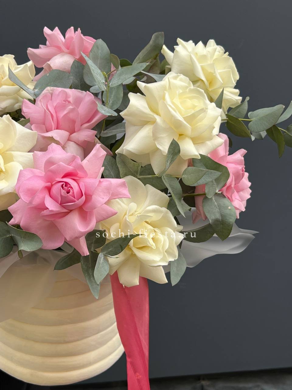 17 французских роз, эвкалипт, цилиндр.