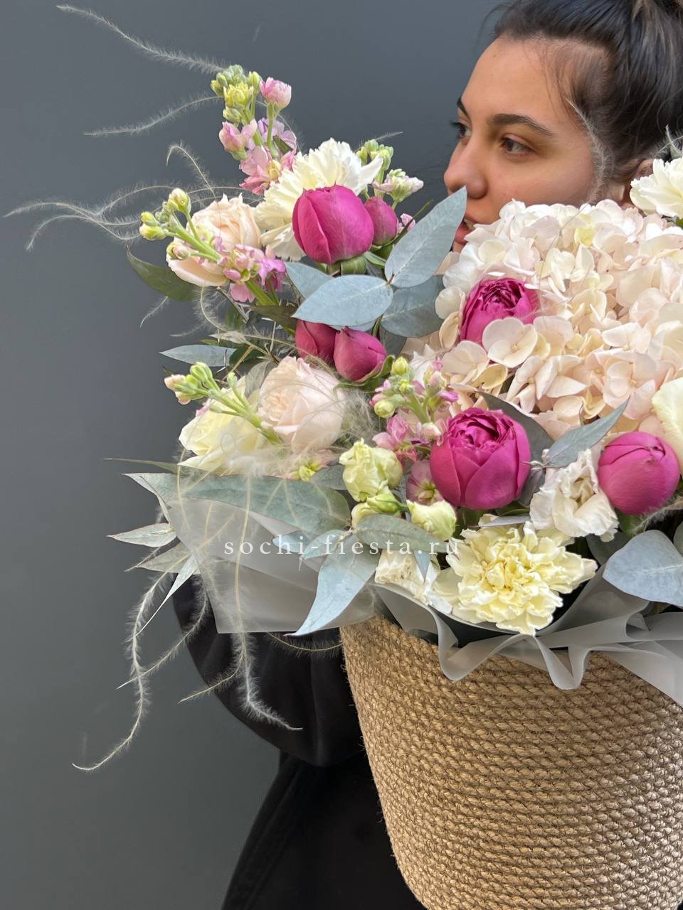 розы и гацинты в джутовом кашпо.