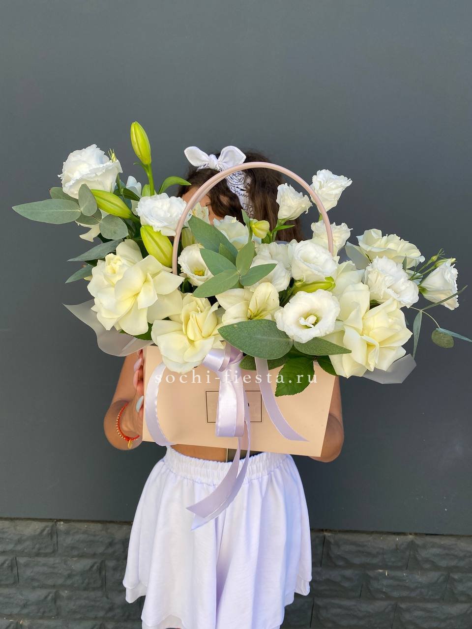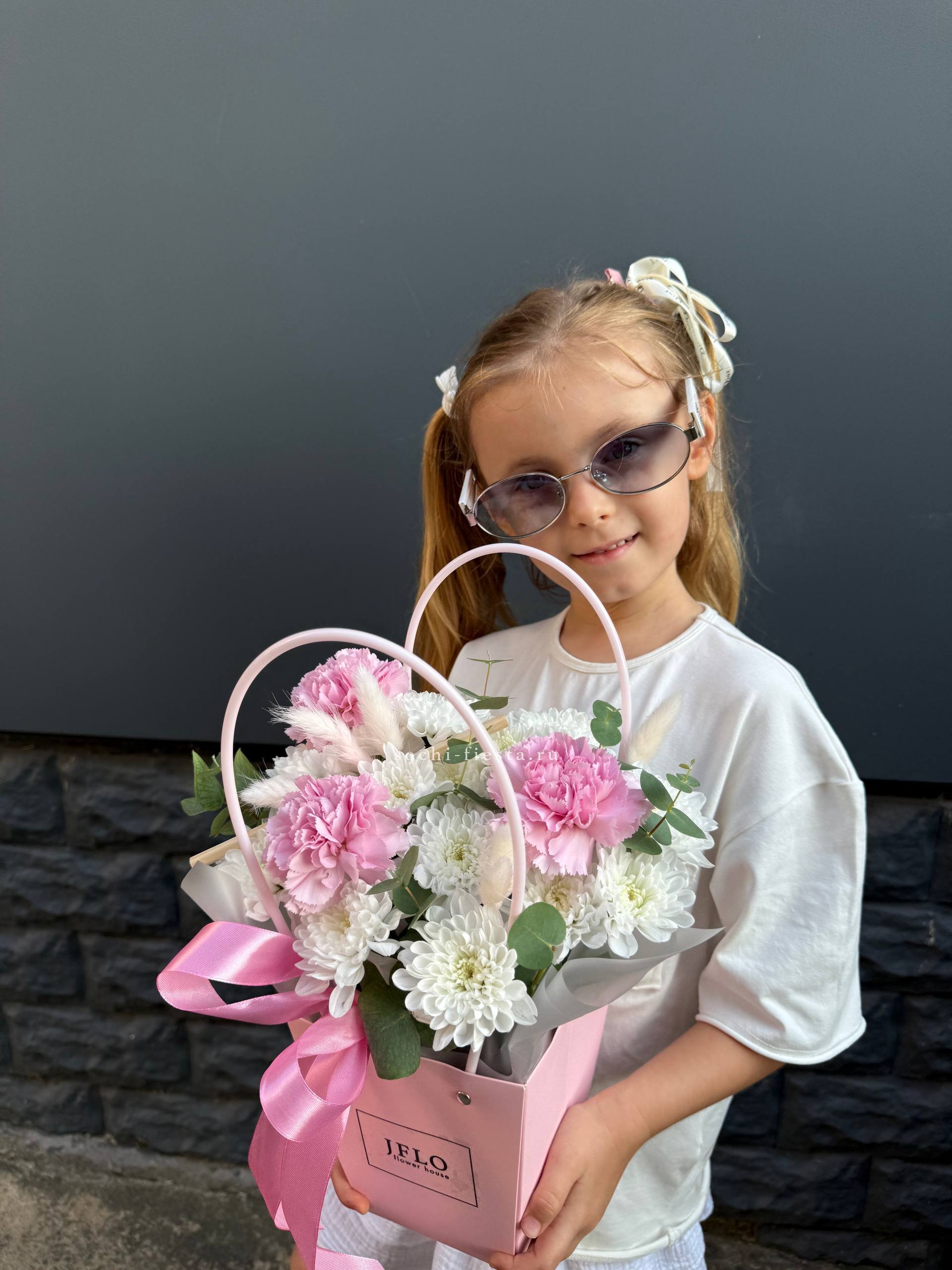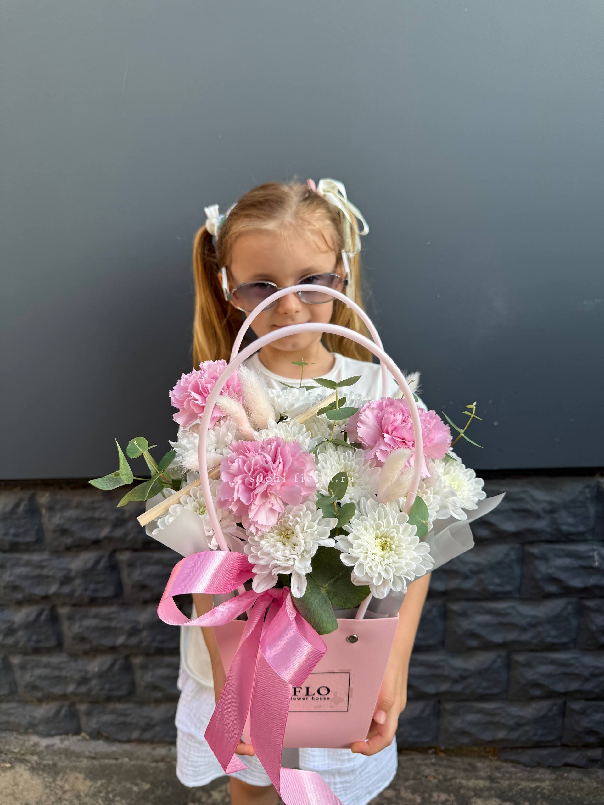 Хризантемы с пушистыми коробочками хлопка создают теплую домашнюю композицию в удобной сумочке. Цветы долго радуют взгляд и не требуют сложного ухода. Формат подходит для размещения в любом уголке дома.