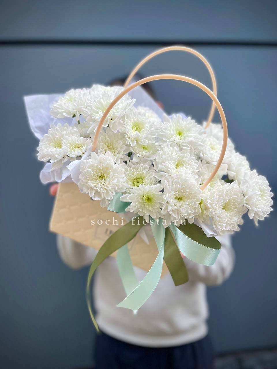 Голубая гортензия и статица задают основной тон, а кустовые розы разбавляют прохладную палитру теплыми нотами. Сумочка держит форму и выглядит собранно.