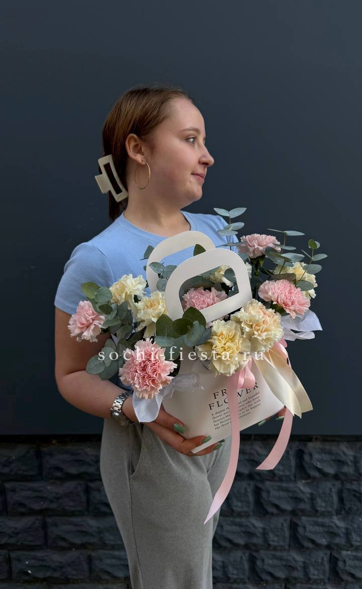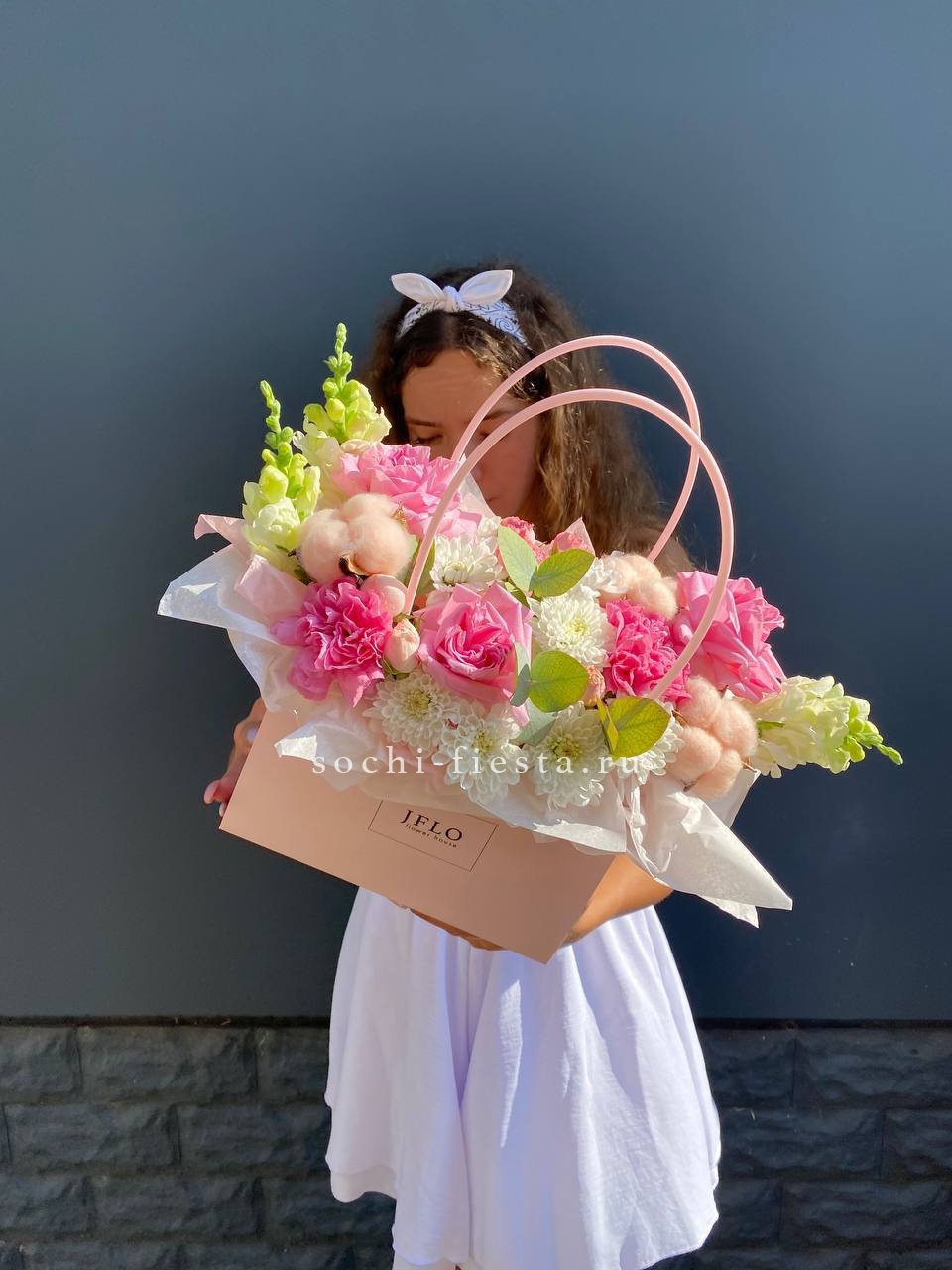 Воплощение изысканности и тренда! Эта стильная композиция в розовой сумочке объединяет в себе яркие цветовые акценты и современный флористический дизайн. Она идеально подойдет для модного образа или в качестве креативного подарка для ценителей необычных решений. Безупречный вкус в каждой детали.
