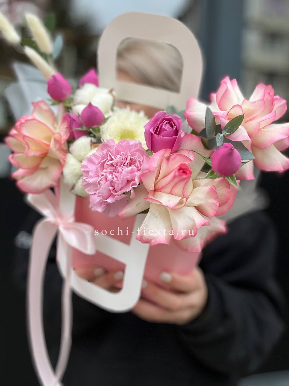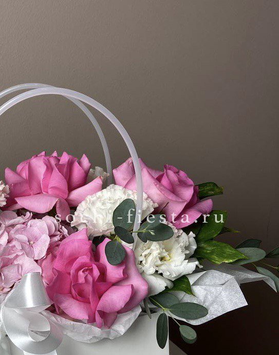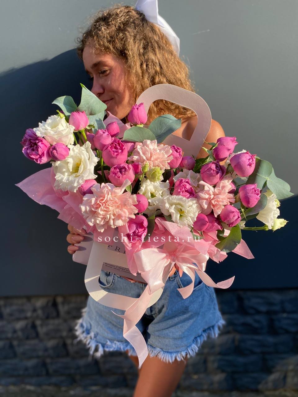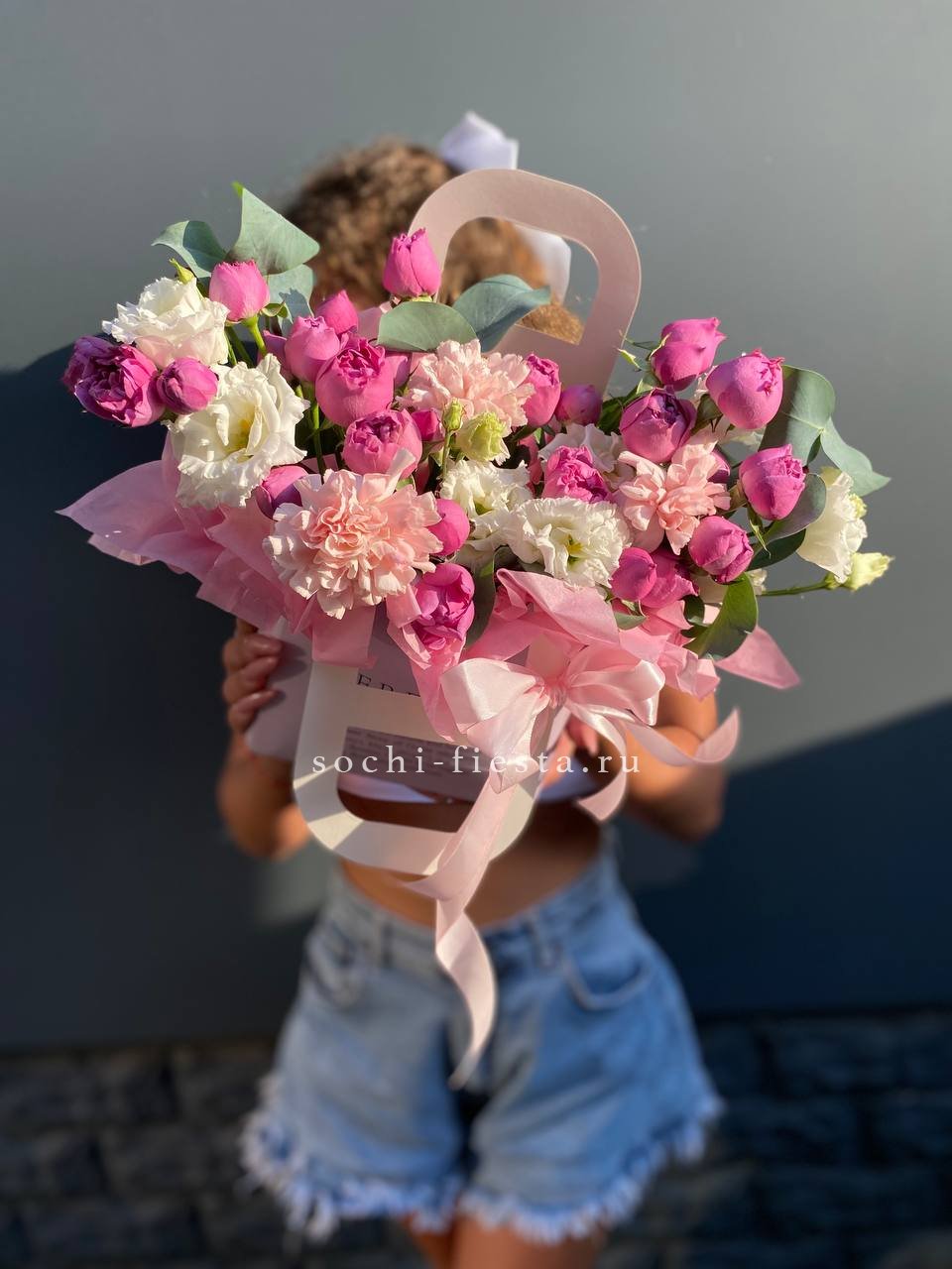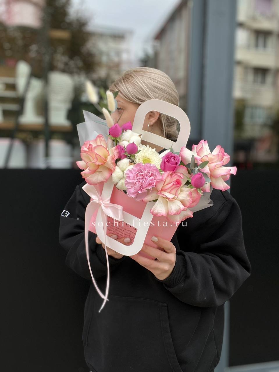Для заказа товара "Сумочка с кустовой розой и диантусами" с доставкой в Химкие нажмите в корзину