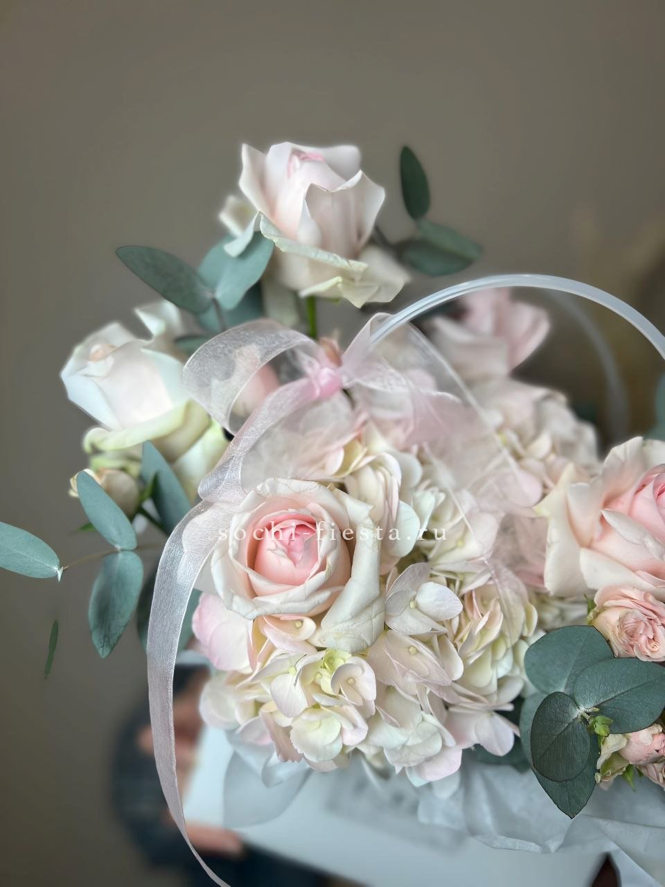 Кустовая роза Мисти Баблс раскрывается множеством бутонов. Эустома добавляет объема, диантусы дополняют палитру. Композиция держит форму и радует долгое время.
