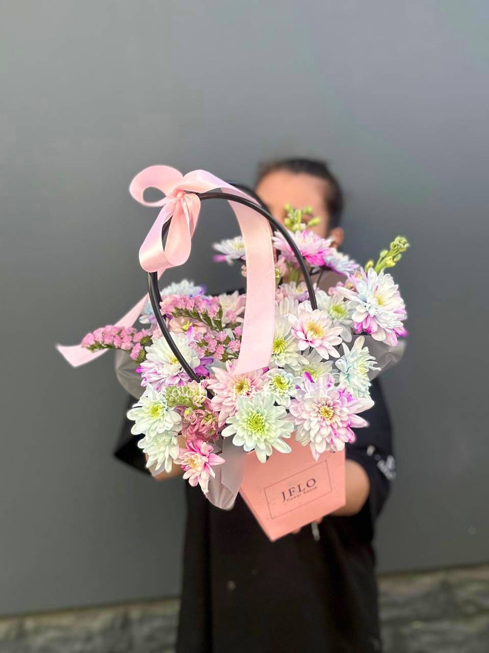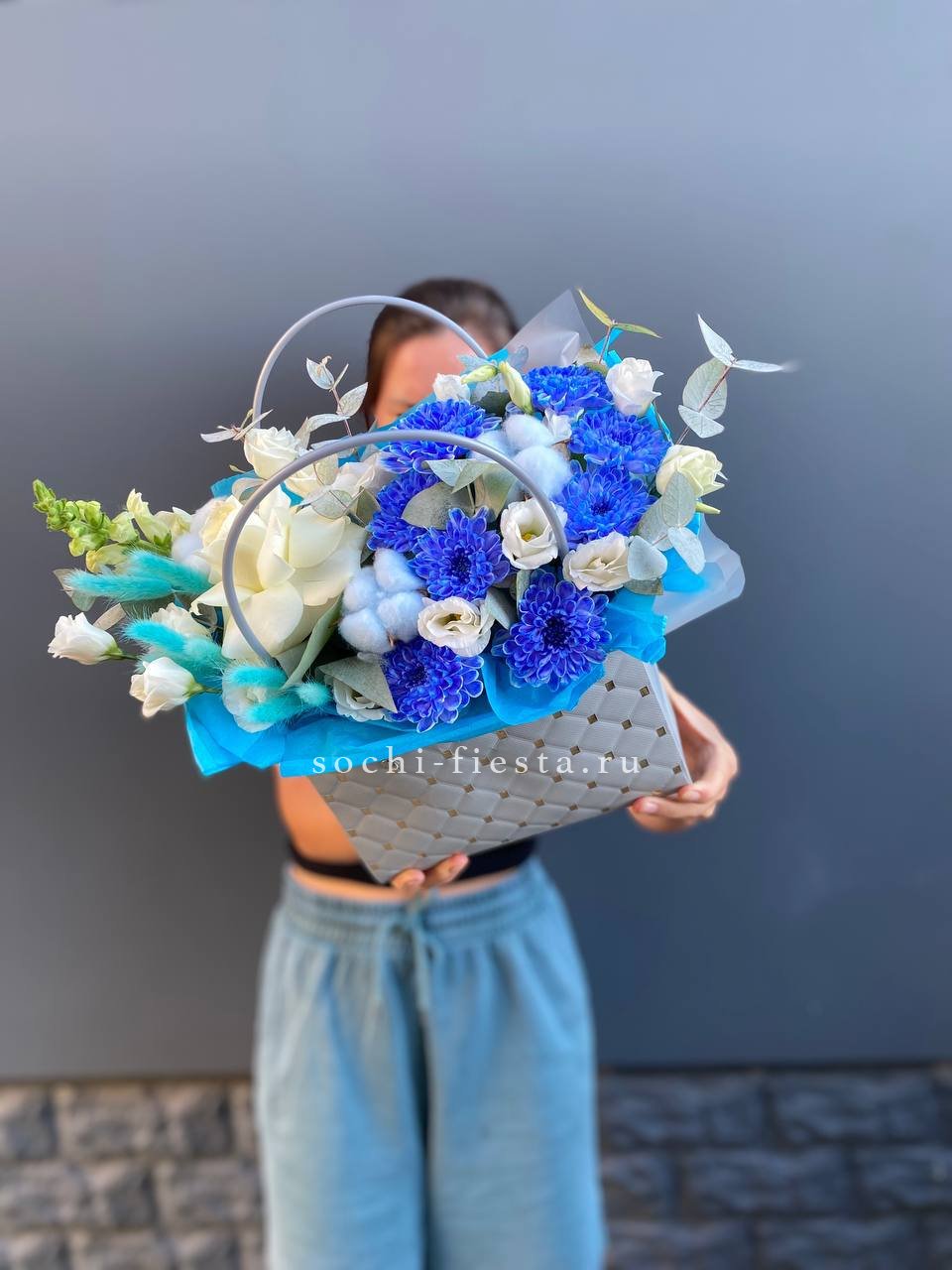Миниатюрная композиция в удобной сумочке сочетает пышные головки хризантем с бархатистыми розами и воздушным диантусом. Веточки эвкалипта добавляют свежести, а компактная форма позволяет разместить цветы на рабочем столе или прикроватной тумбе.
