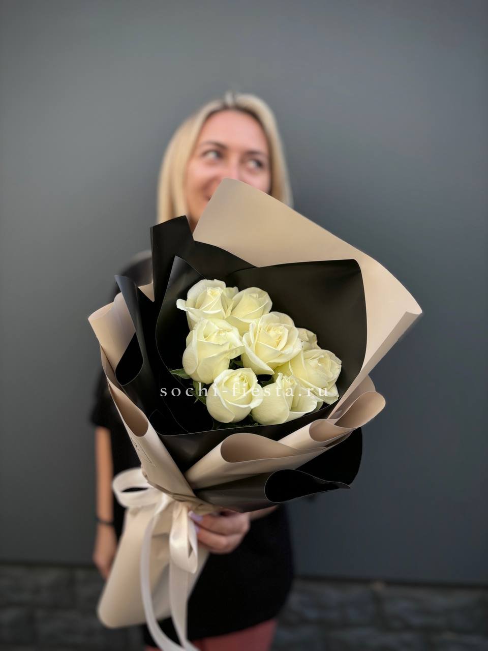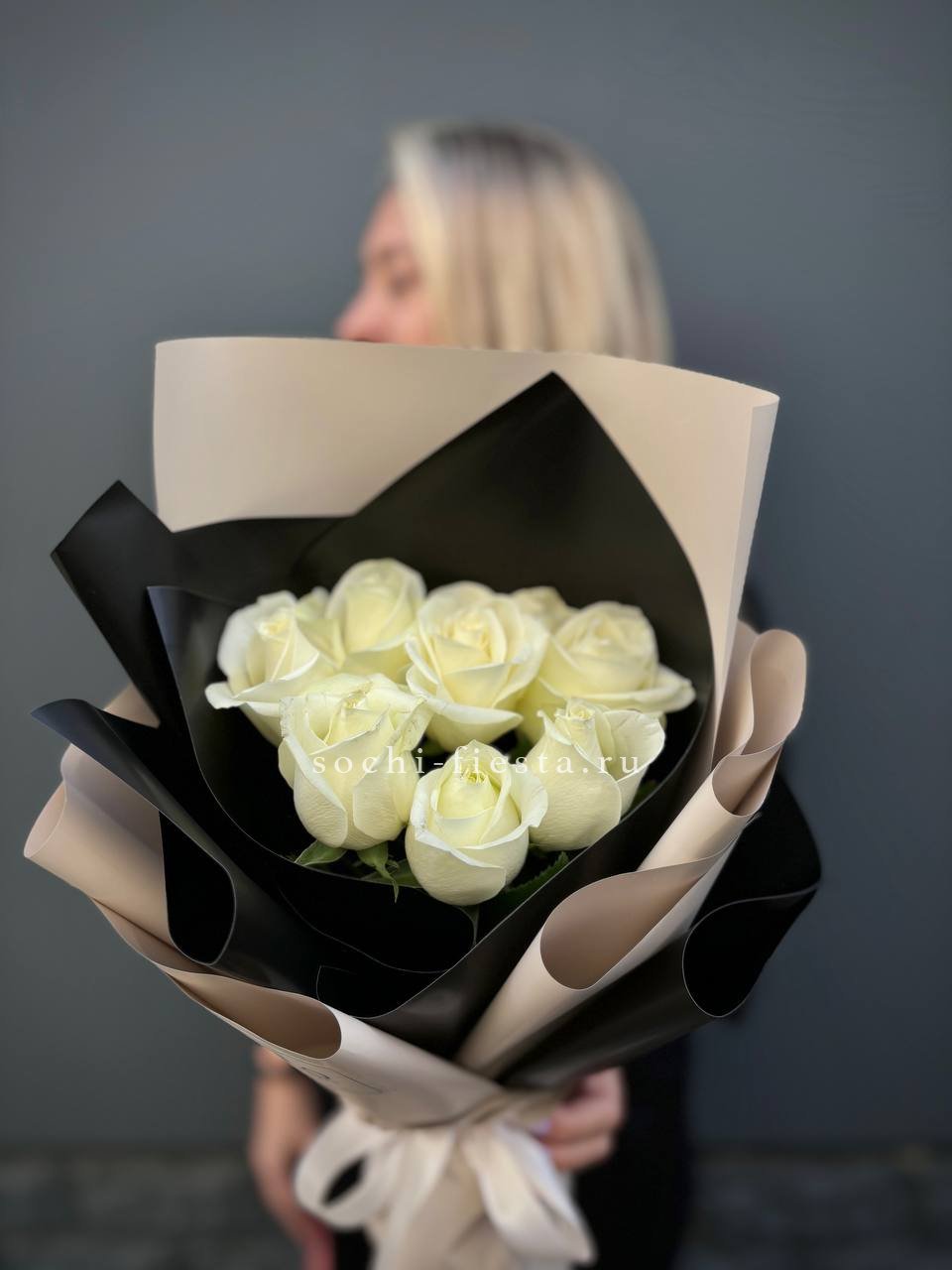 Белоснежные розы в минималистичной подаче отражают современную деловую эстетику. Семь бутонов образуют лаконичную форму без лишних деталей.