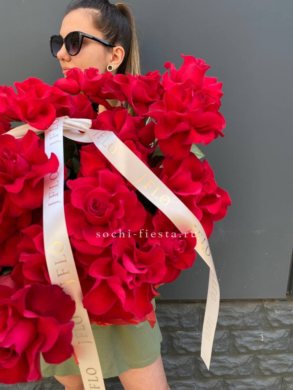 Корзина вмещает двести один бутон, образующих пышное цветочное полотно. Классическая форма подачи позволяет разместить композицию в любом пространстве без необходимости искать вазу. Впечатляющий объем для важных событий.