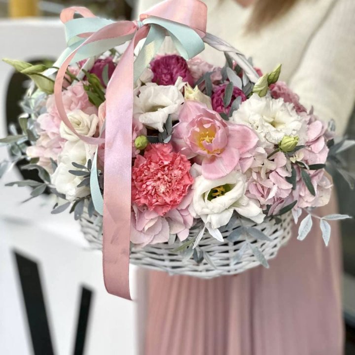 садовая цветочная корзина с эустомой ранункулями и зеленью в свободном стиле от местного флориста сезонная пионовая корзина с Sarah Bernhardt и декоративной зеленью для именинного подарка