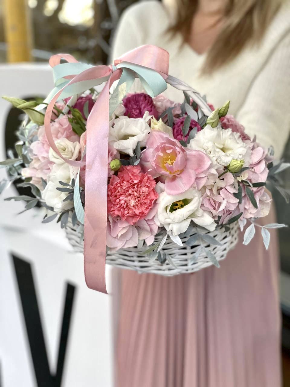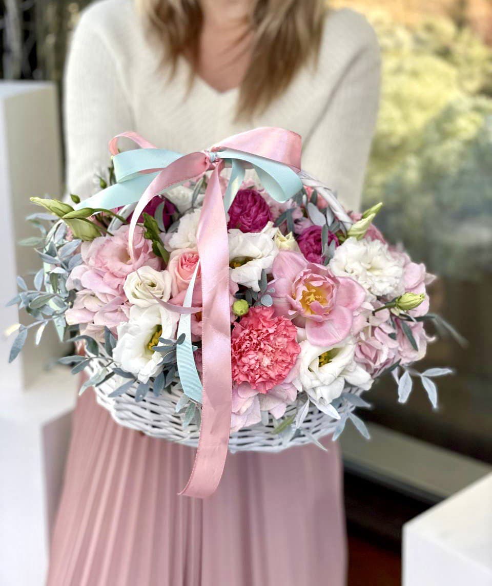 орхидея, гортензия, эустома, роза, эвкалипт, альстромерия, лента, корзина.