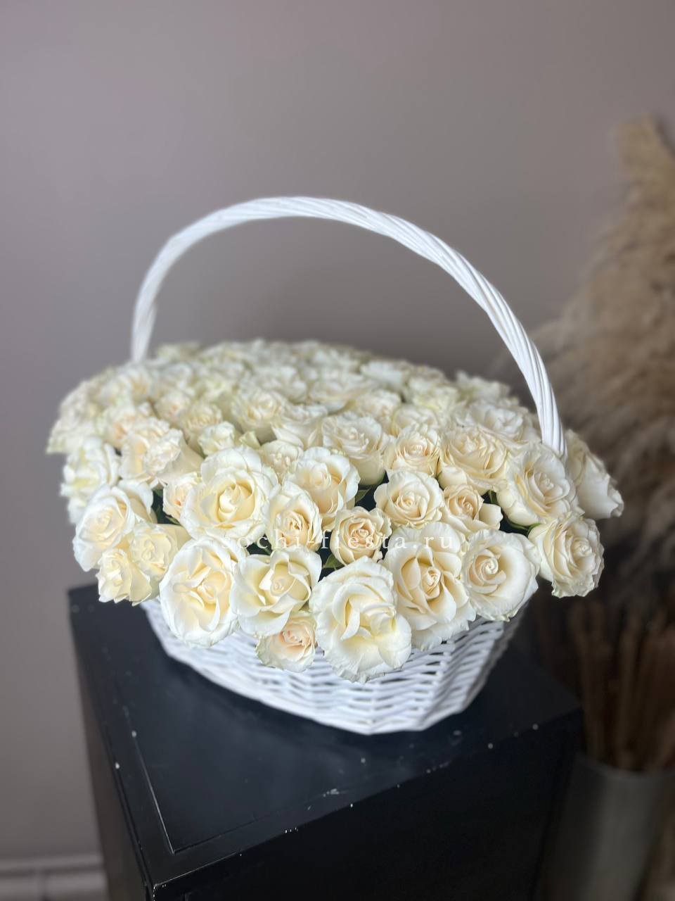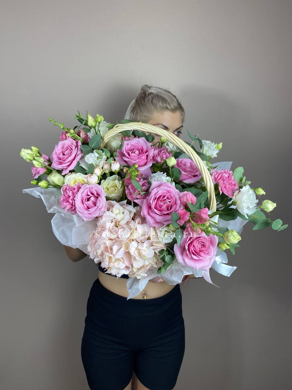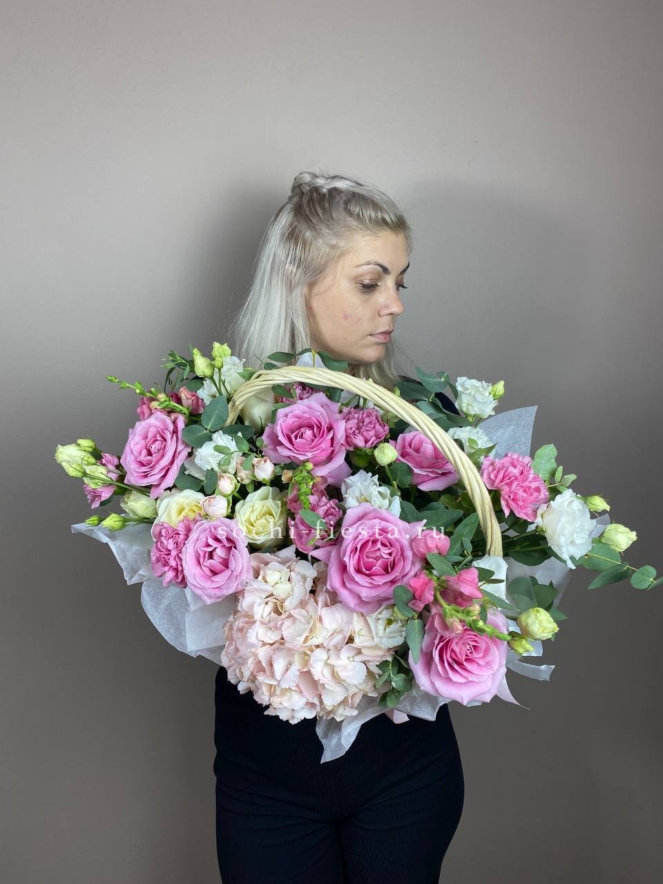 Сорок одна пионовидная роза в светлой корзине выстраивает объёмную композицию с мягкими переливами лилового и розового. Эвкалипт обрамляет густую россыпь бутонов.