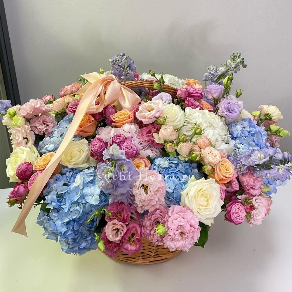 Пышная композиция в плетеной корзине объединяет розы, гортензию, эустому и дельфиниум в единую объемную форму. Маттиола и бомбастик добавляют воздушности, а эвкалипт создает мягкий природный фон. Корзина удобно располагается на любой поверхности и держит форму без дополнительной опоры.