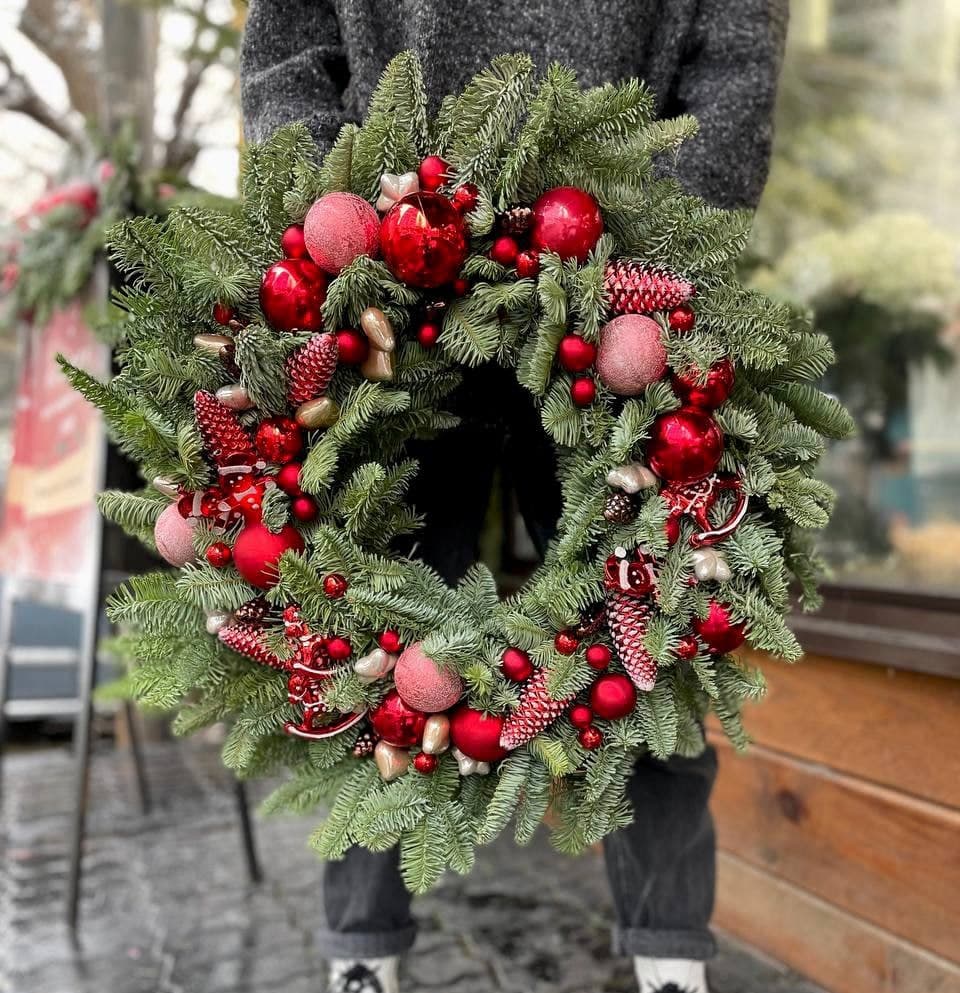 Крупный венок из датского нобилиса с насыщенной хвоей и праздничным декором. Игрушки распределены по окружности и задают ритм всей композиции.
