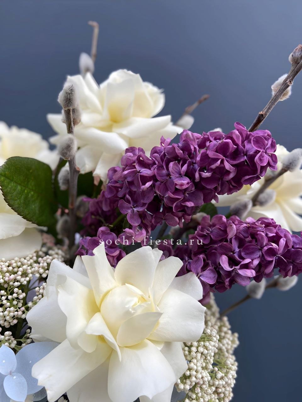 Цветочная композиция идеальна для Православных Праздников! Состав выполнен из белых роз, вербы, сирени, диантусов и озотамнуса.