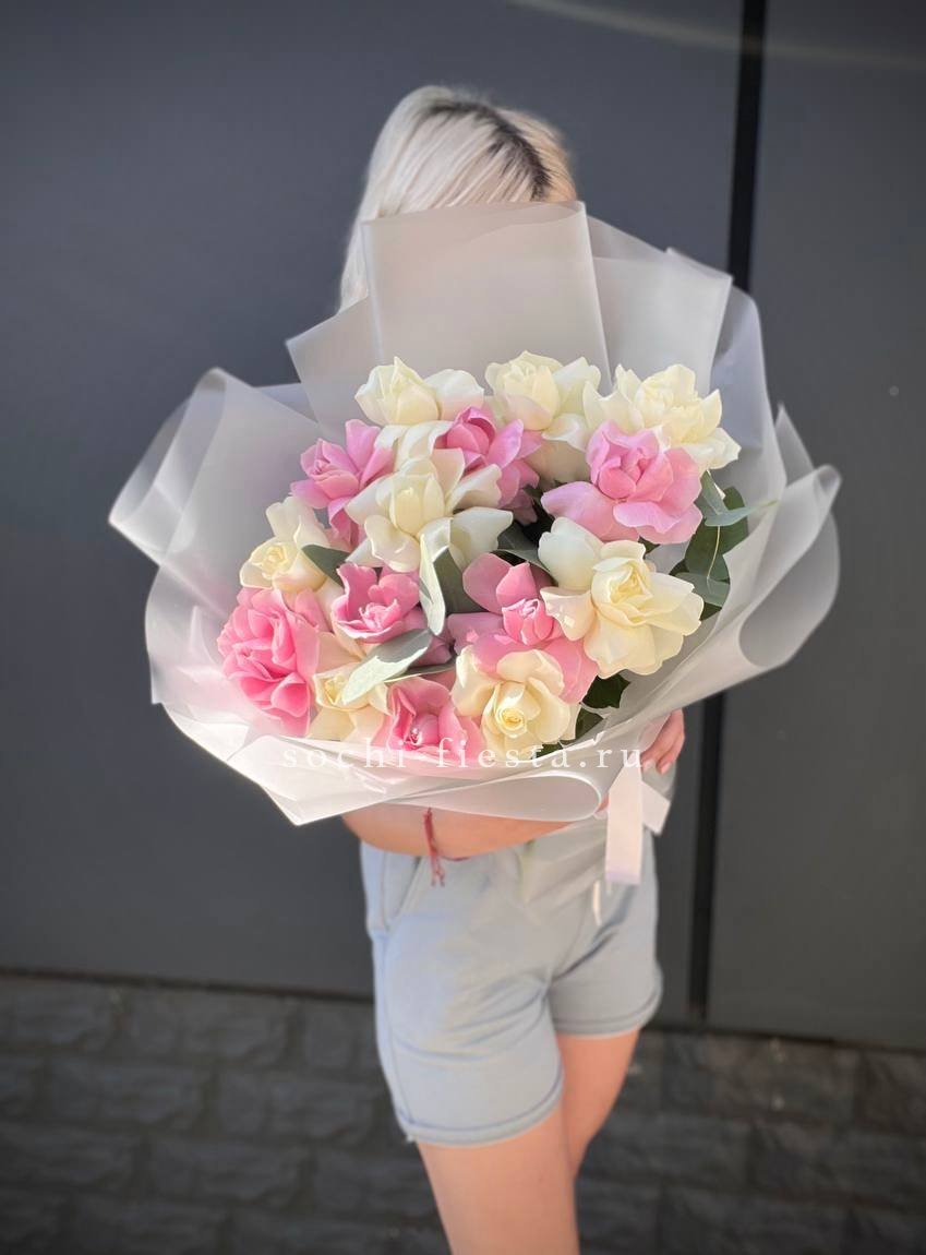 Красные и белые розы чередуются в крупной композиции, создавая живую игру света и тени между бутонами. Контрастная палитра подчеркивает свежесть каждого цветка и придает динамику всему букету.