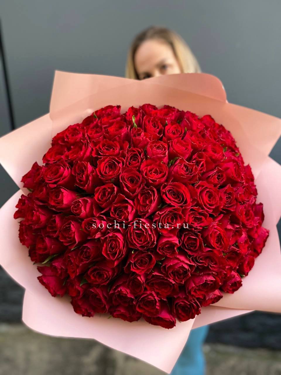 Сто одна белая роза собрана в впечатляющую охапку. Монохромная гамма и повторяющийся ритм бутонов создают мощное визуальное присутствие. Такой объём заполняет пространство и приковывает внимание.