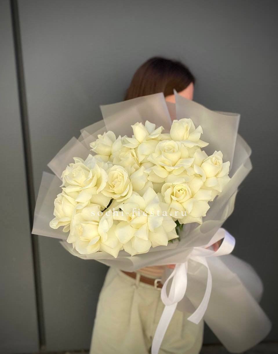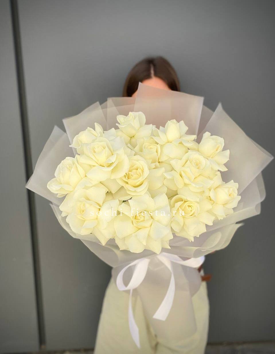 Пятнадцать белоснежных роз собраны в лаконичную форму и упакованы в цилиндр. Монохромная композиция выглядит свежо и современно в любом интерьере.