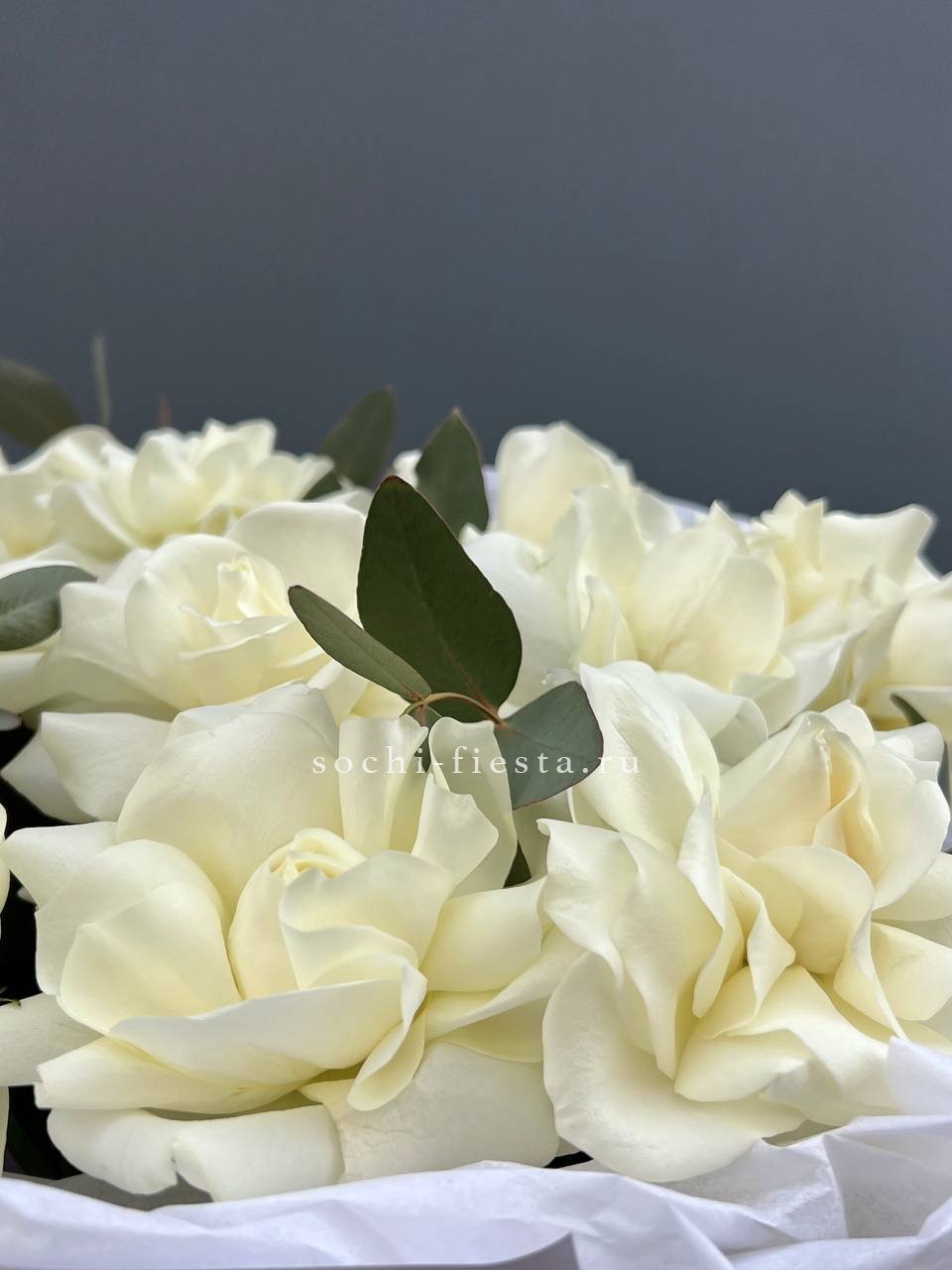 Тридцать девять бутонов образуют плотную белоснежную сферу. Каждый цветок раскрывается постепенно, сохраняя свежесть и форму на протяжении многих дней. Классика в чистом виде.
