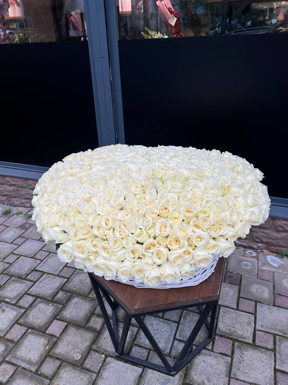 Пятнадцать белых роз собраны в плотный букет с чистыми линиями. Прозрачная упаковка сохраняет свежесть и открывает естественную красоту бутонов.
