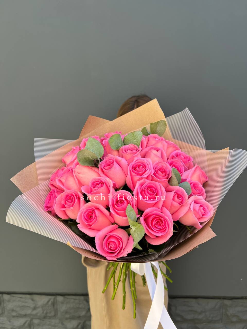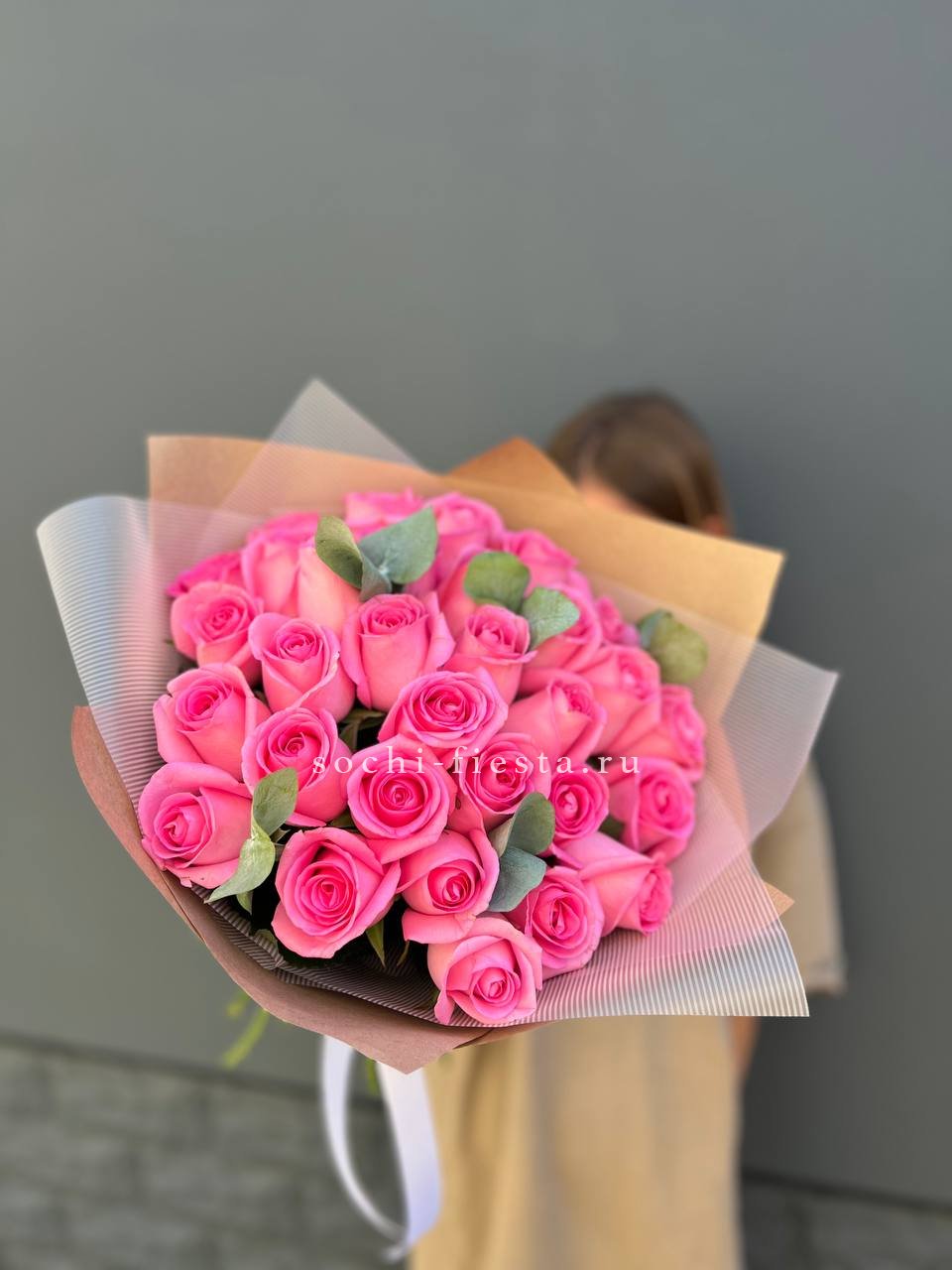 Двадцать одна роза в оригинальной упаковке с игривыми ушками создает настроение легкости и свежести. Розовые бутоны собраны в аккуратную композицию, которая удерживает форму и выглядит выразительно в любом интерьере.