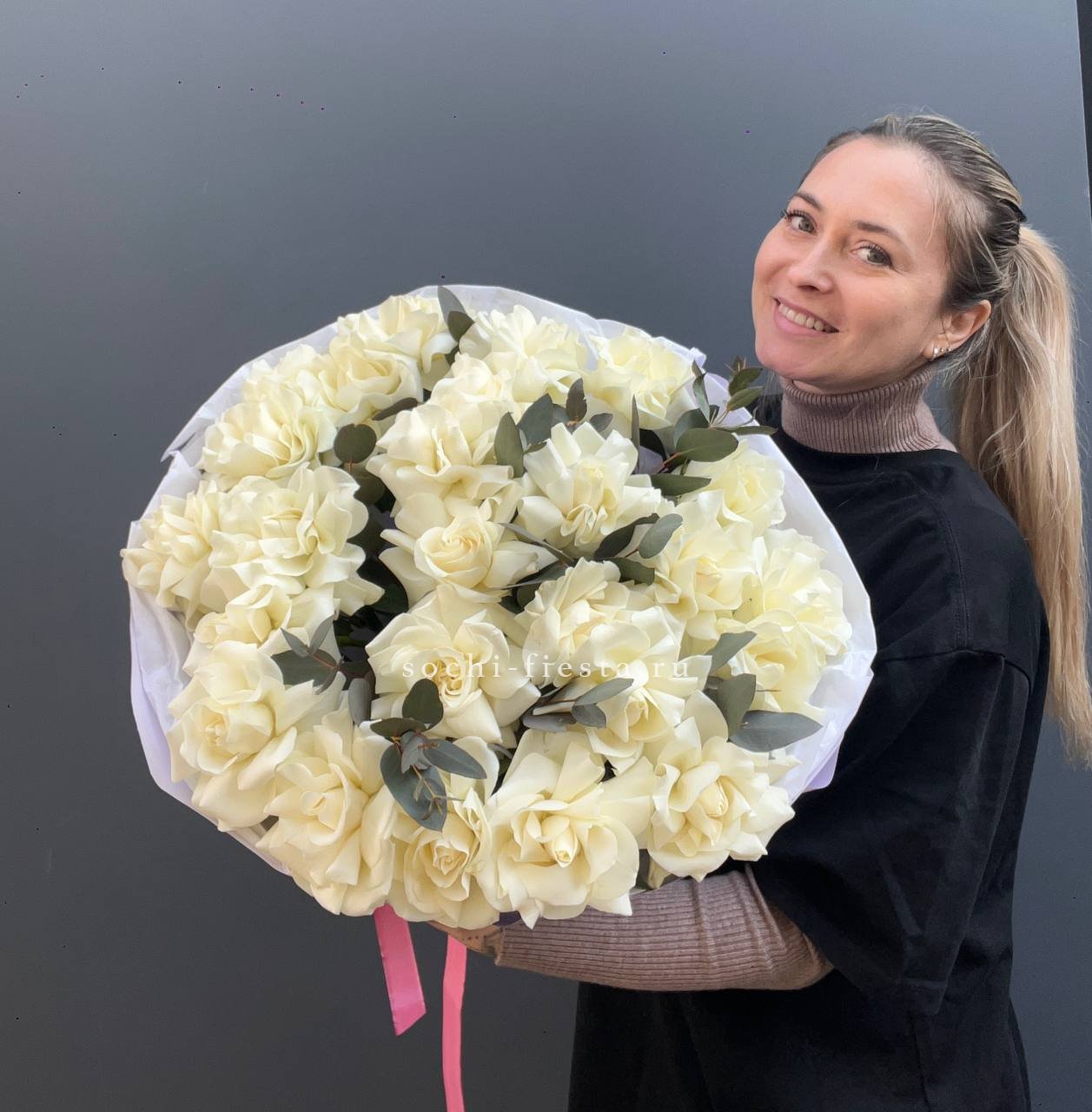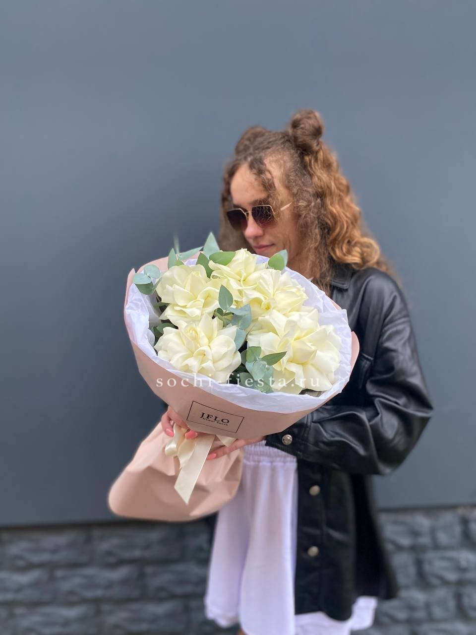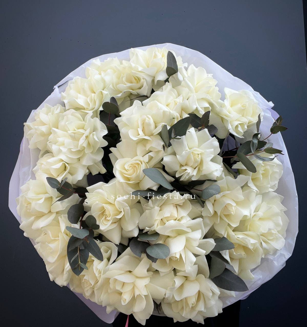 Пять французских роз с вывернутыми лепестками раскрываются широко и создают эффект лёгкой небрежности. Эвкалипт поддерживает форму и добавляет свежести белому цвету.