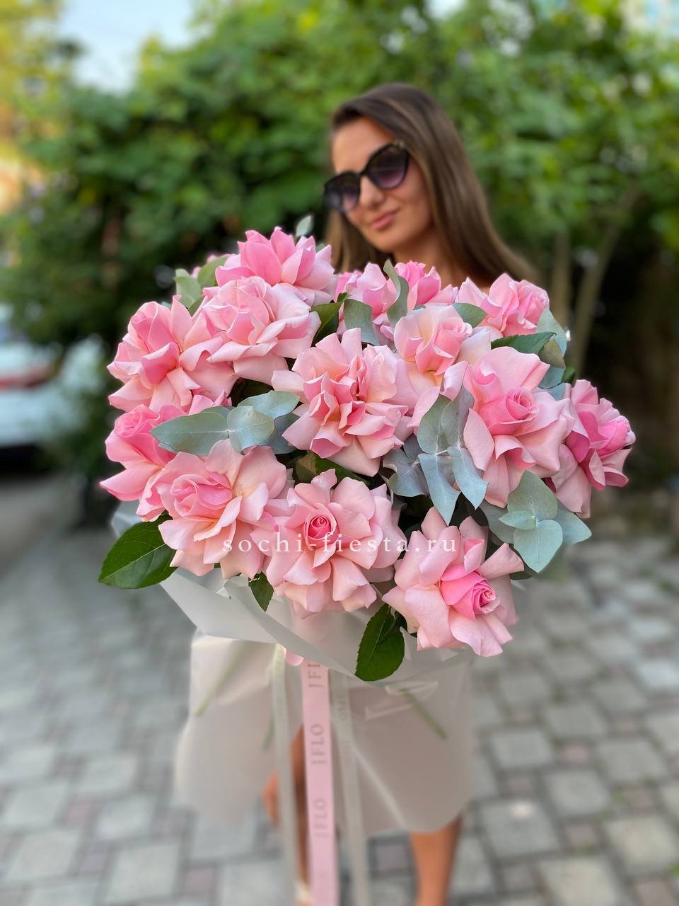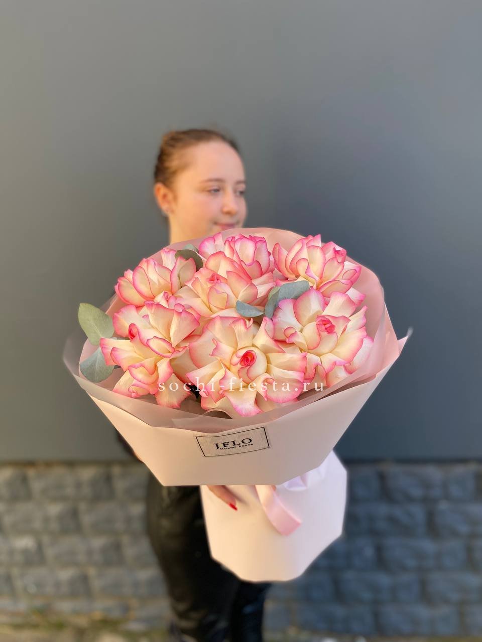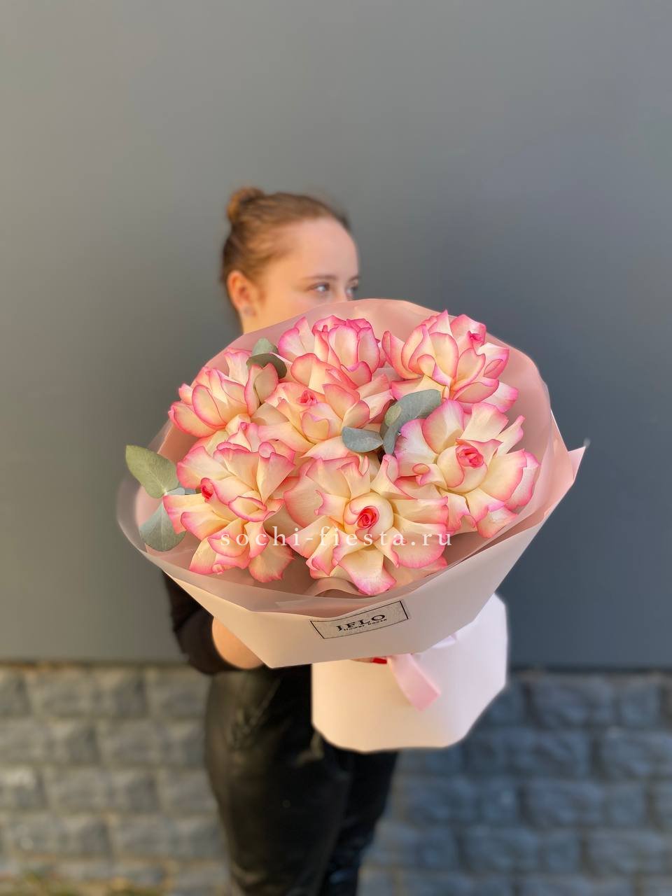 французские розы - 11 шт., эвкалипт-1шт, лента, авторская упаковка.