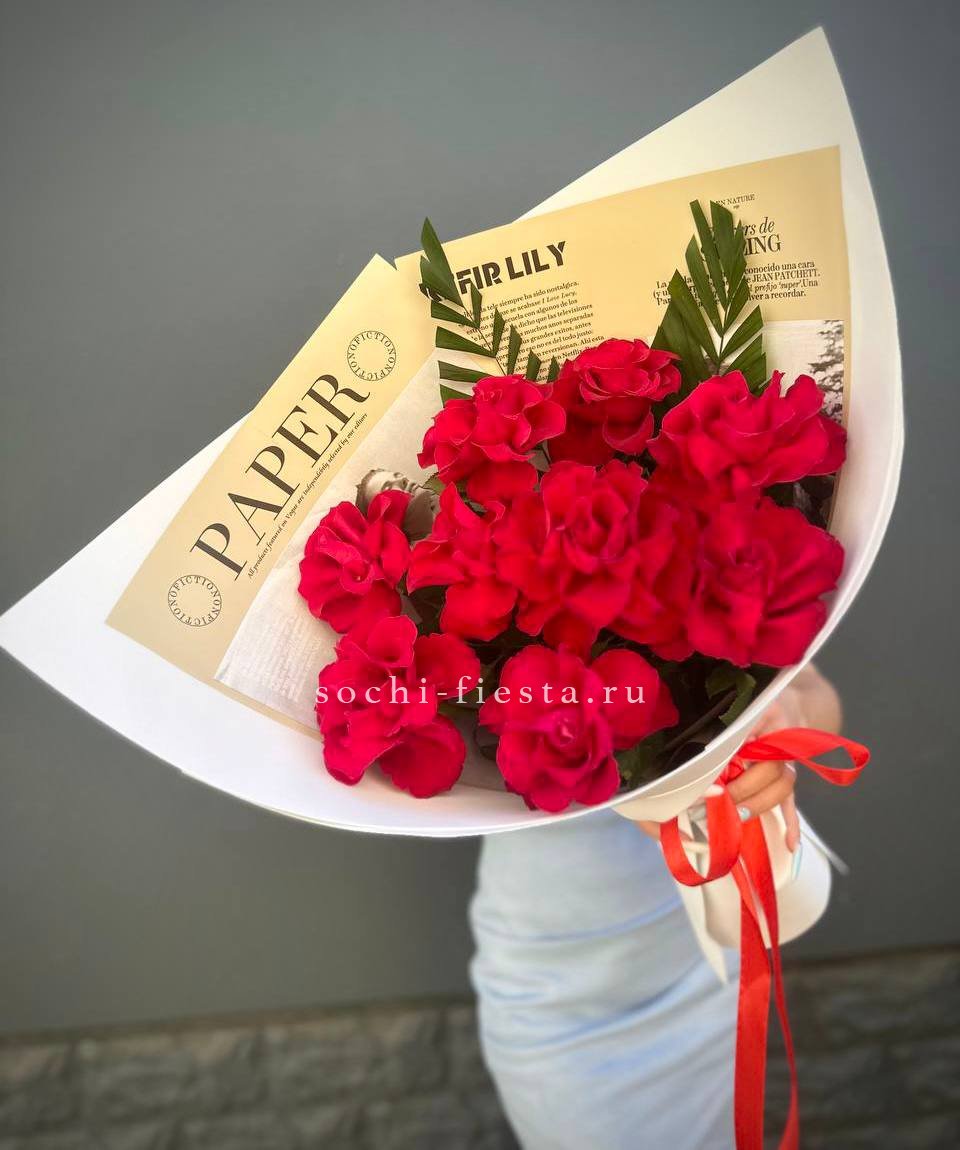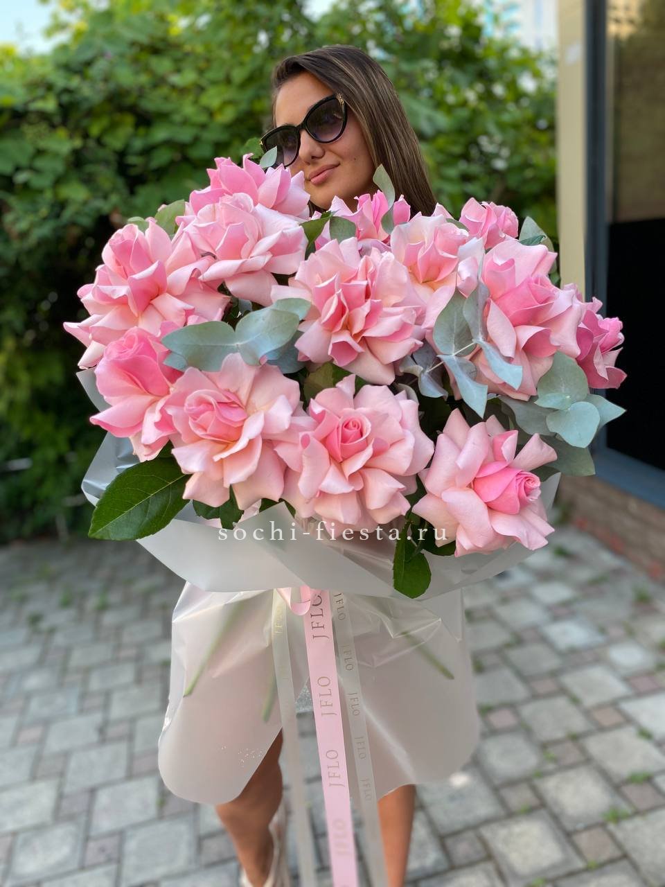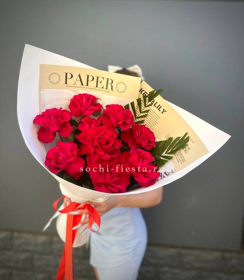 французские розы - 11 шт., эвкалипт-1шт, лента, авторская упаковка.