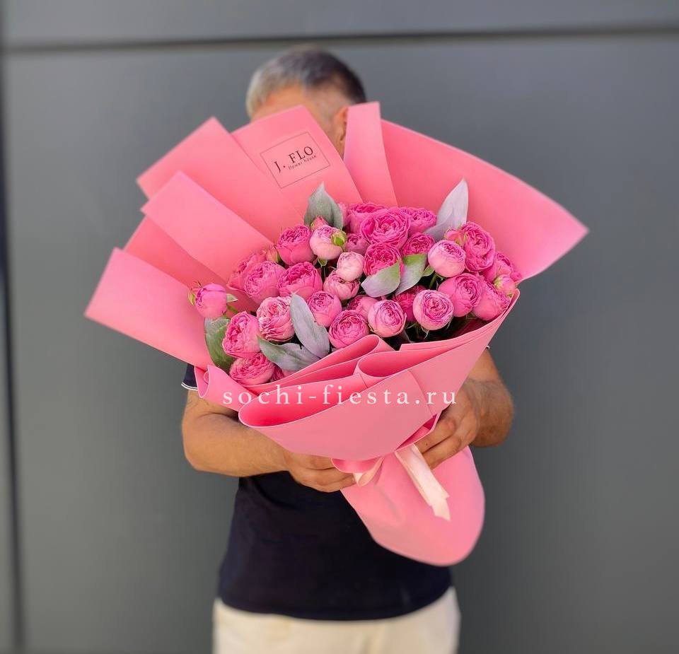 11 пионовидных кустовых роз Bombastic (или Porcelain Lace), дизайнерское оформление, лента.