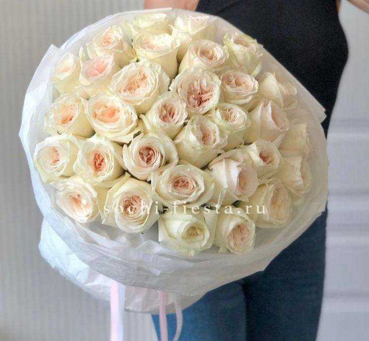 розы пионовидные 15 шт, эвкалипт, пленка, лента.