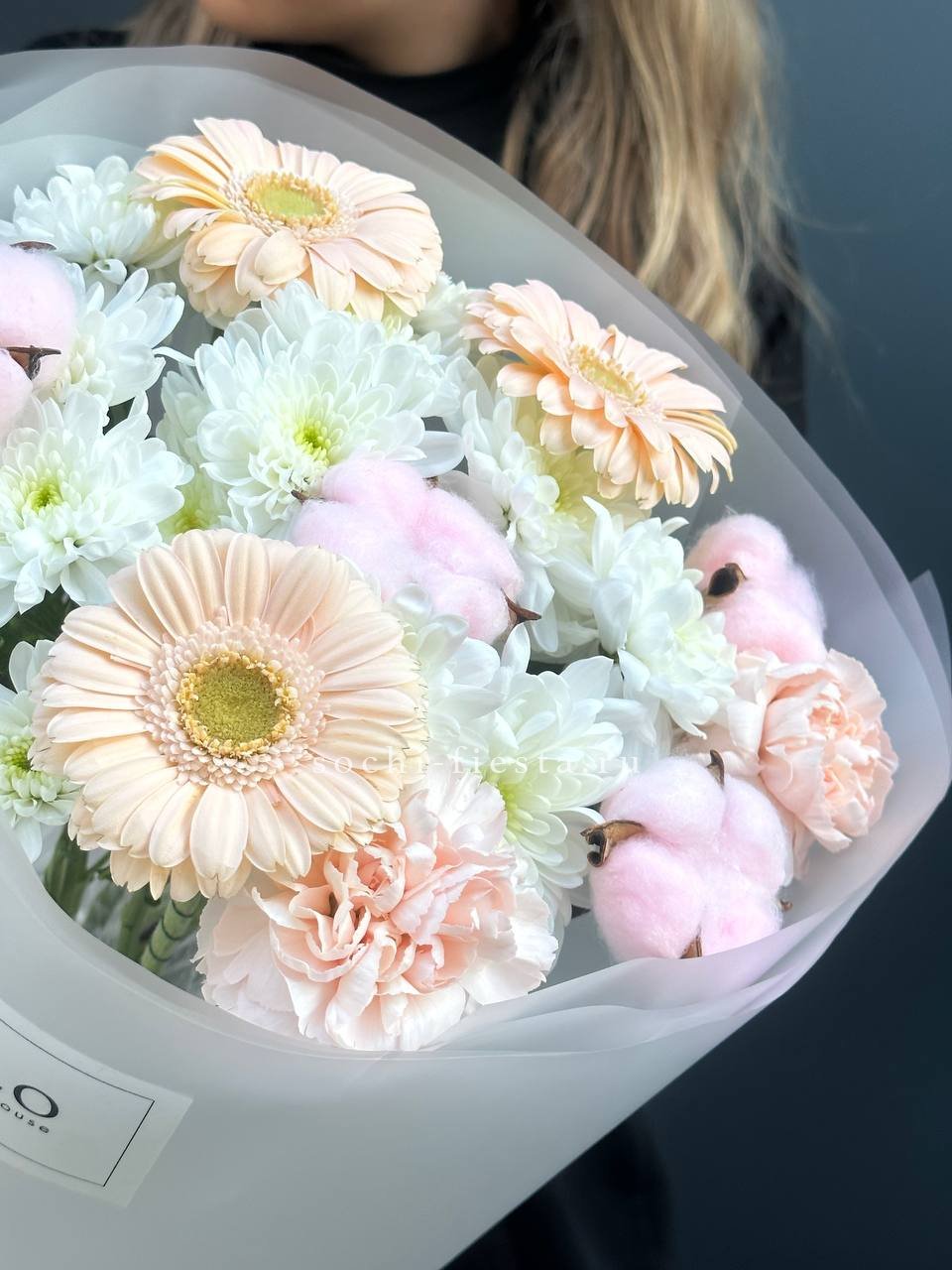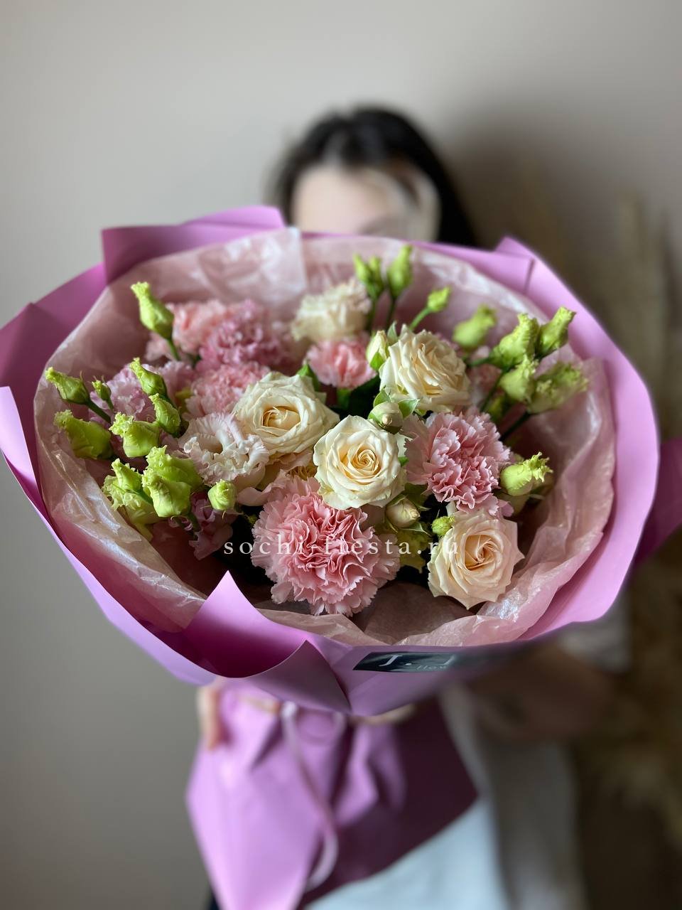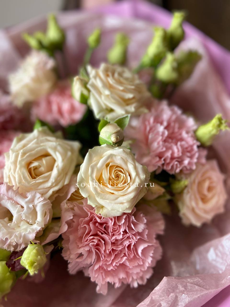 Воздушная композиция в кремовых и белых тонах собрана из нескольких видов цветов с разной формой бутонов. Эустома и диантусы создают мягкую текстуру, а кустовые розы добавляют объём и завершённость силуэту.