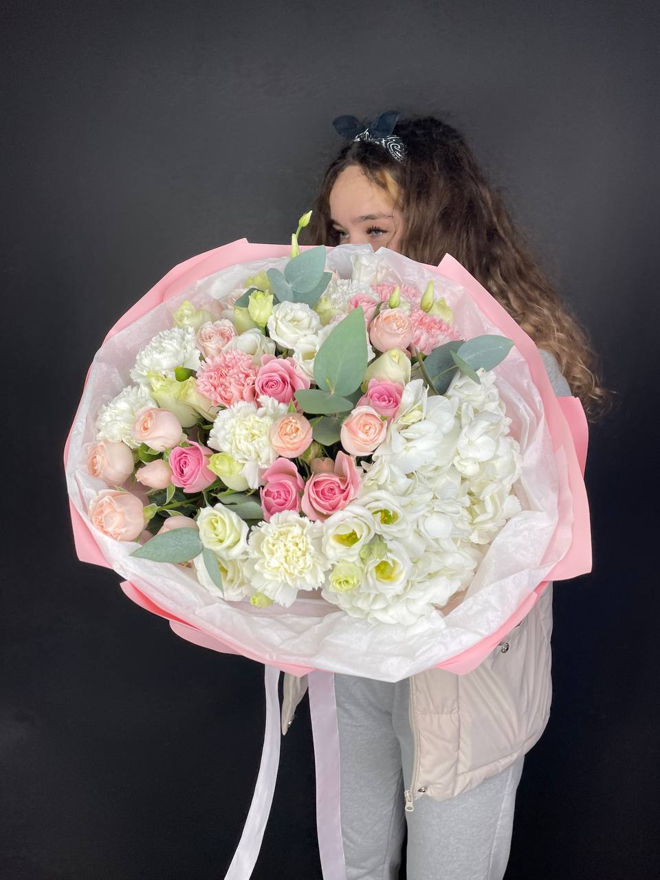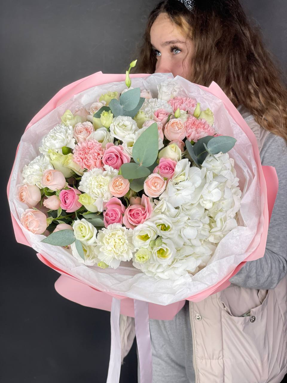 Мисти Баблс раскрывается плотными лепестками среди белоснежной гортензии и эустомы. Композиция построена на игре фактур — от крупных бутонов до мелких соцветий кустовой розы.