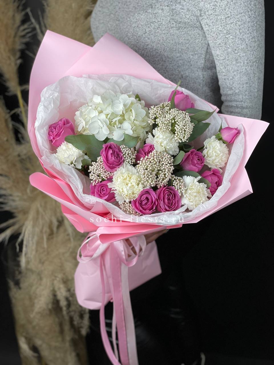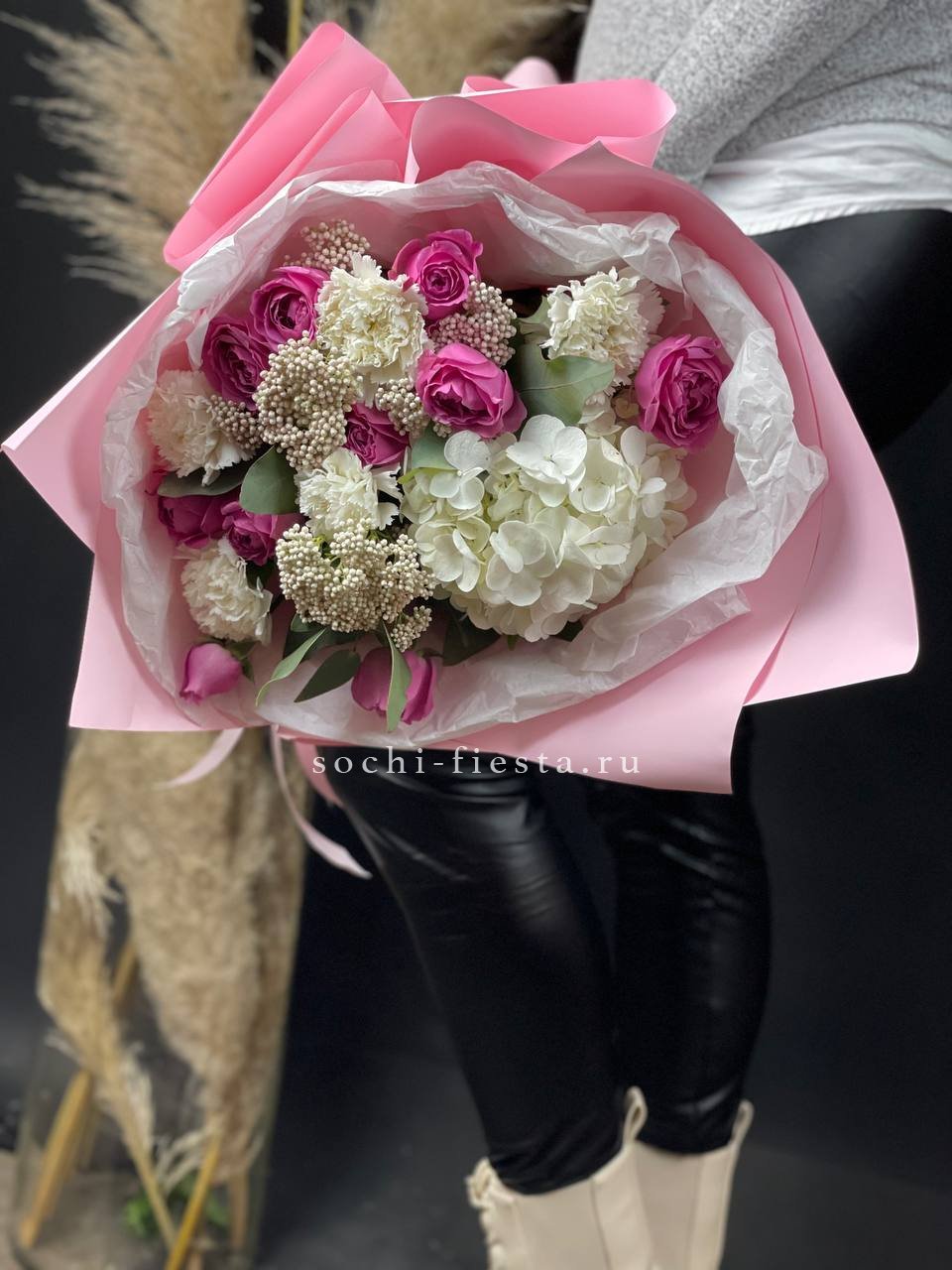 гортензия, диантус, хризантема, озотамус, розовые розы, оформление.