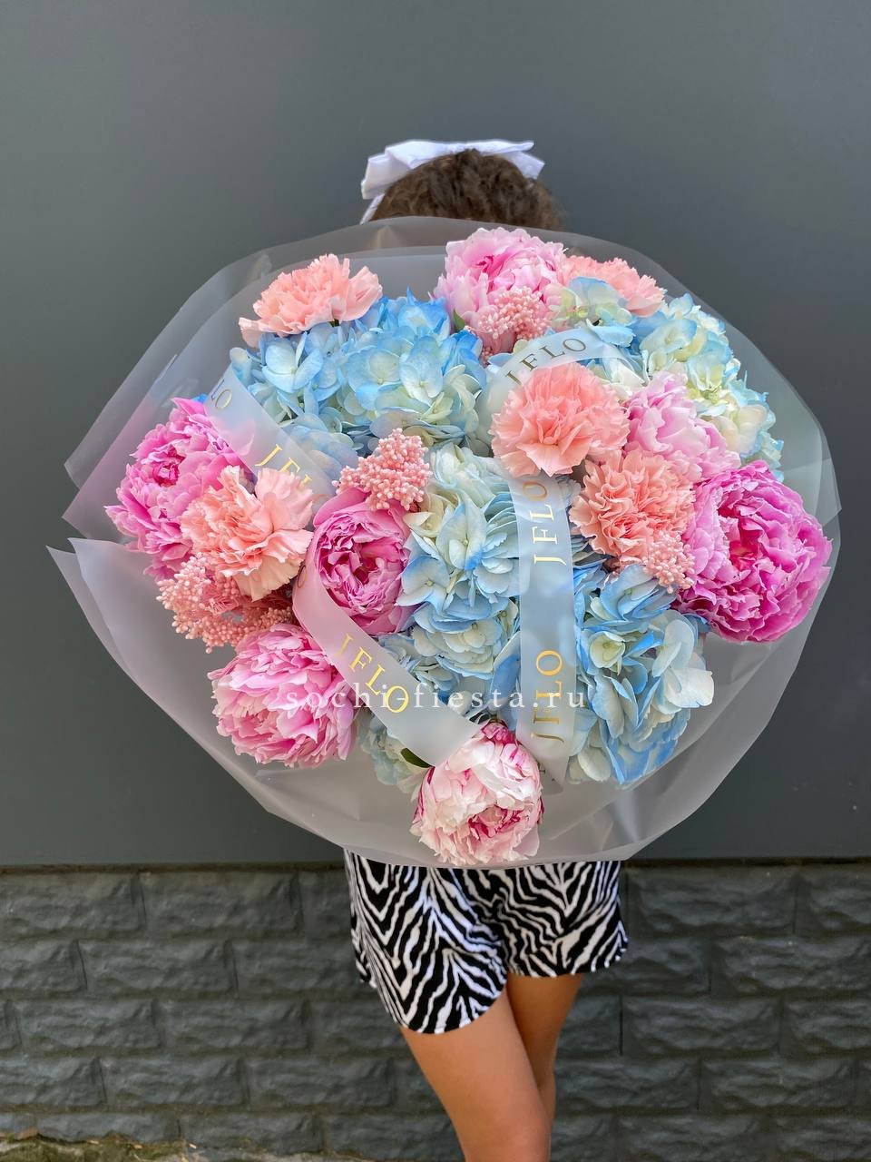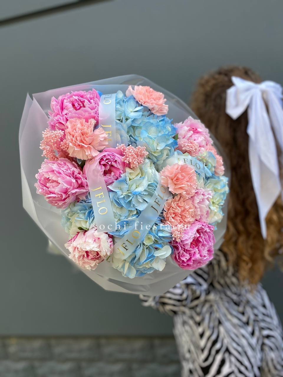 пионы, озатамус, гортензии, диантусы, лента и дизайнерская пленка.