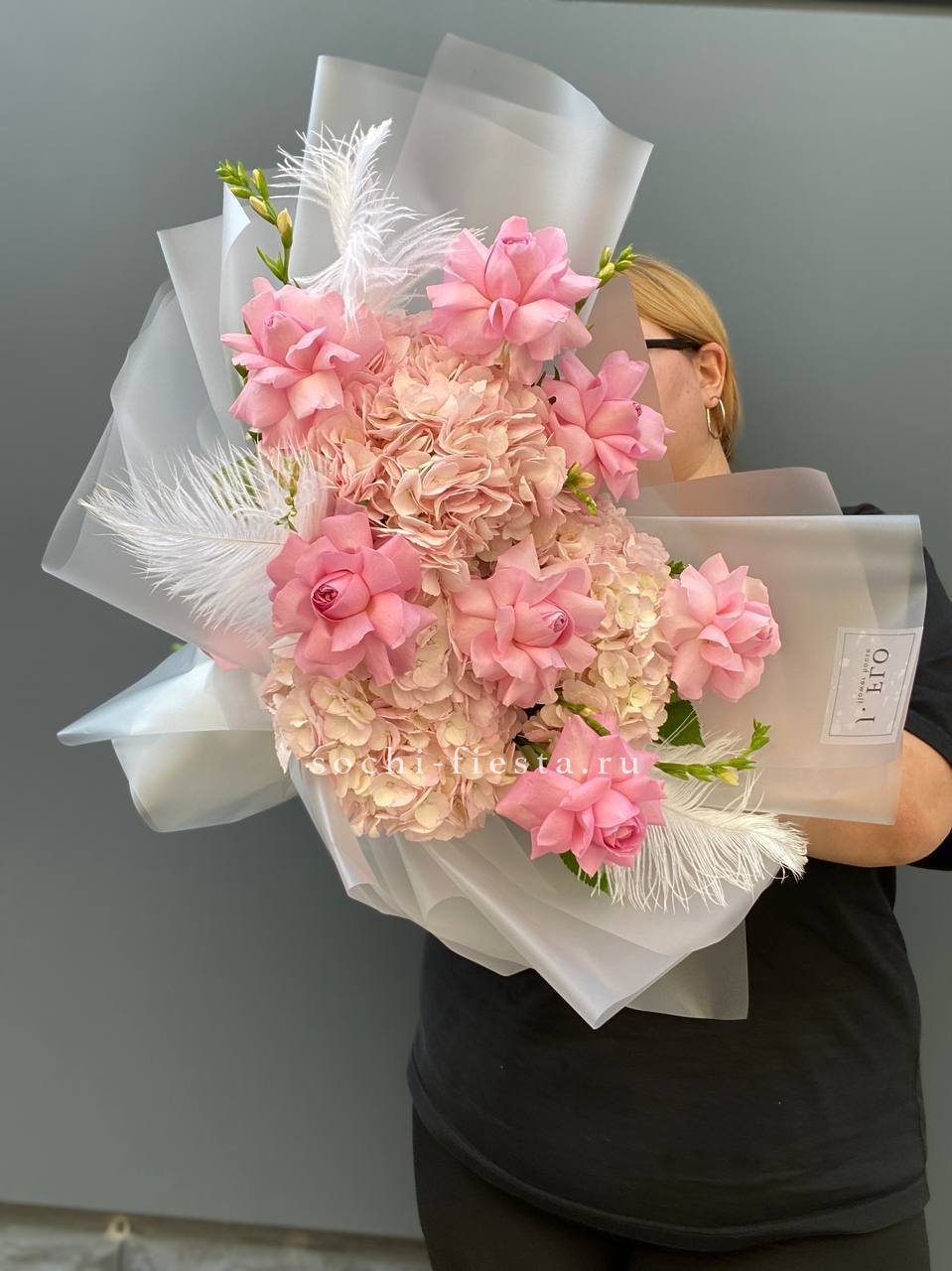 гортензии, розовая роза, перья, упаковка.