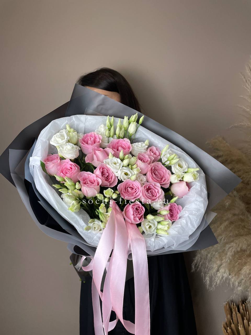 гортензия, диантус, хризантема, эустома, розы, озатамус, пленка.