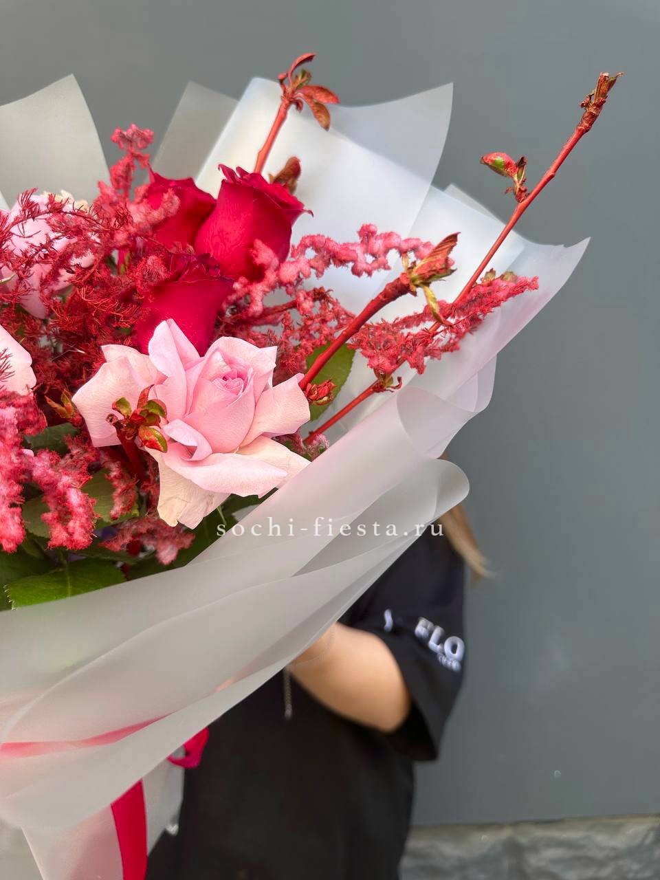 Красные и розовые оттенки переплетаются с цветущими ветками и пушистым лагурусом. Аспарагус добавляет воздушности, а кустовые розы заполняют пространство живой энергией. Букет держит форму и притягивает взгляд.