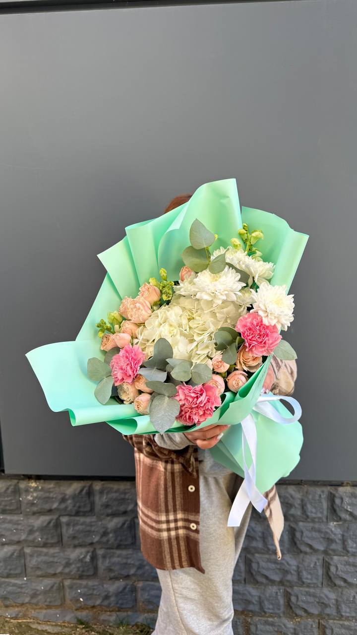 Этот пышный авторский букет в мятно-пастельных тонах — само воплощение весенней свежести и легкости.