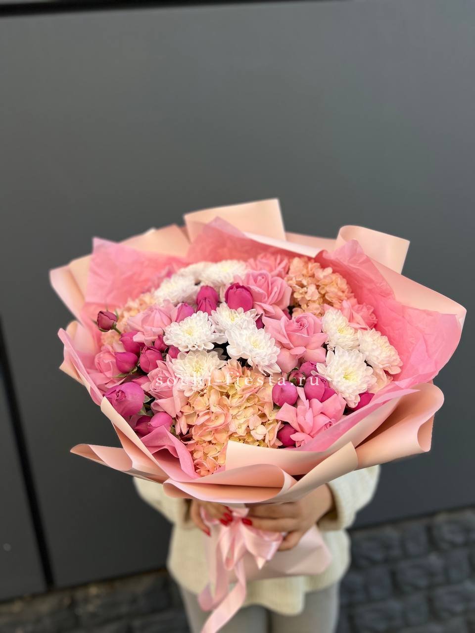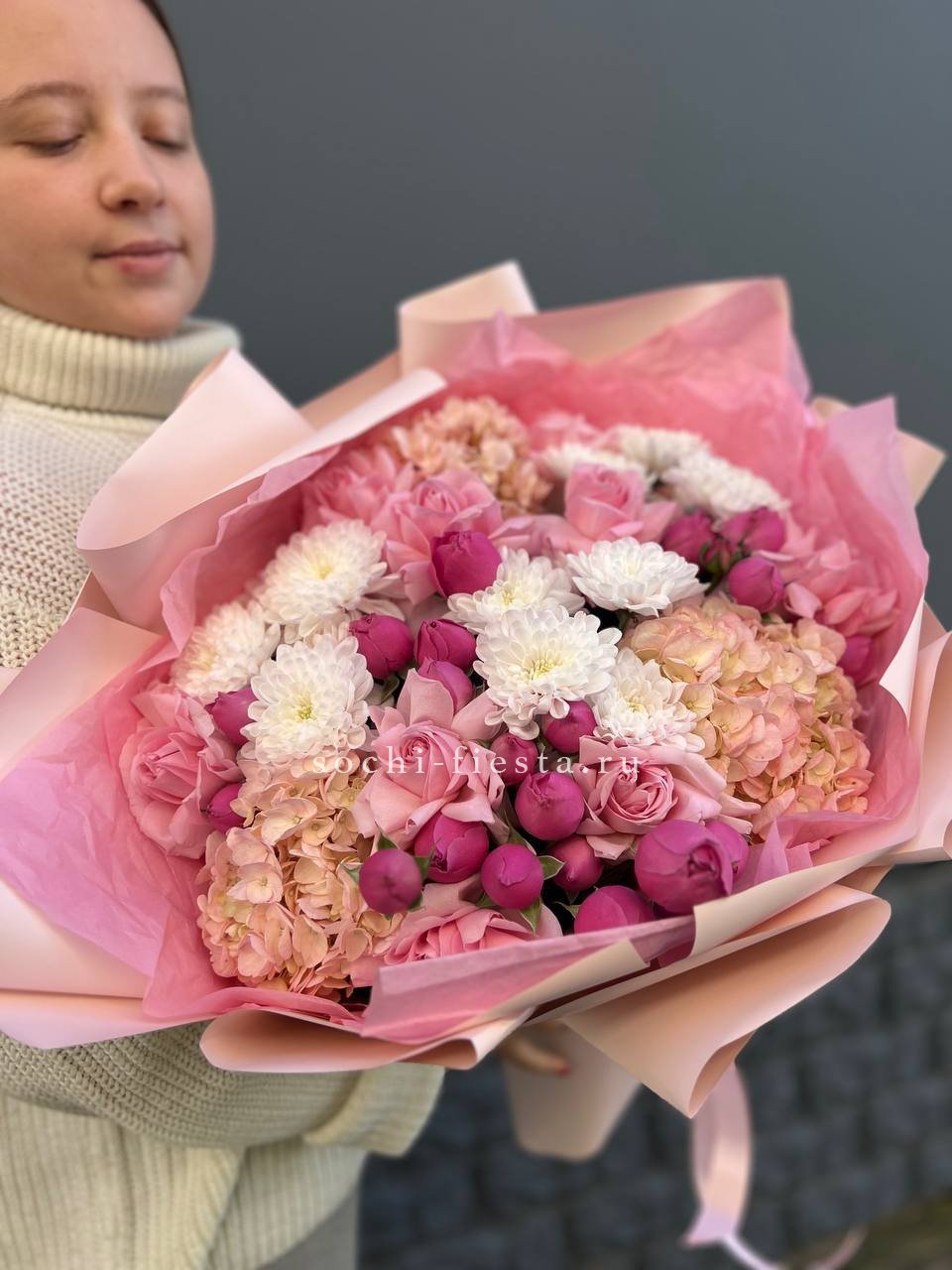 хризантема кустовая, гортензия, мисти баблс, розы в нежном оформлении.